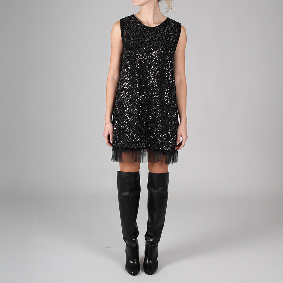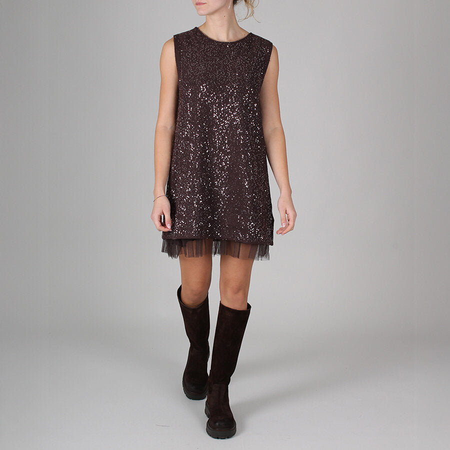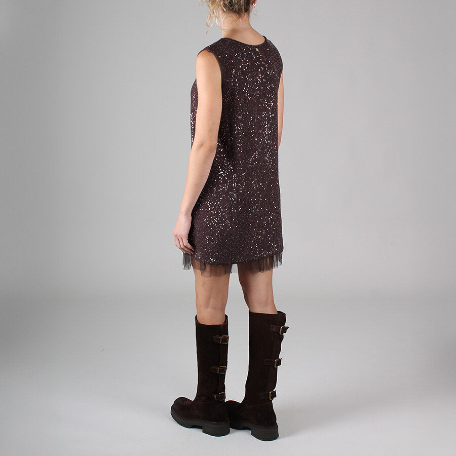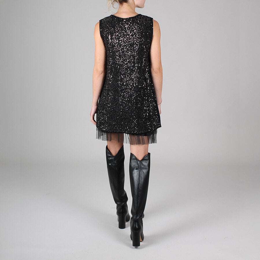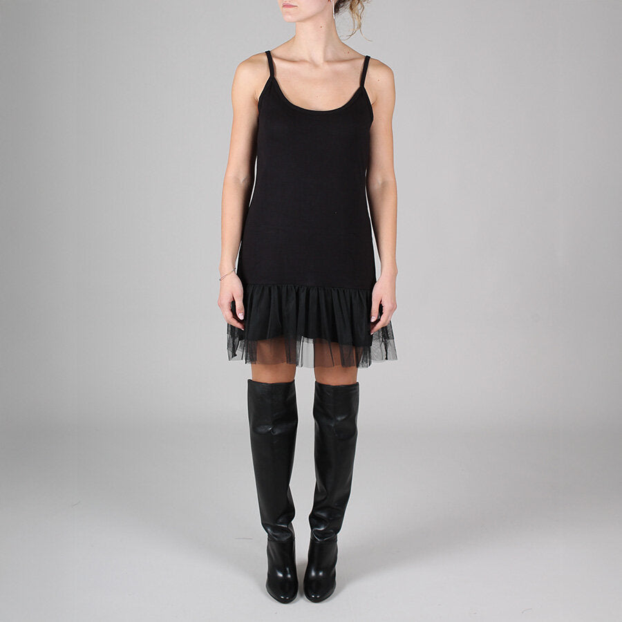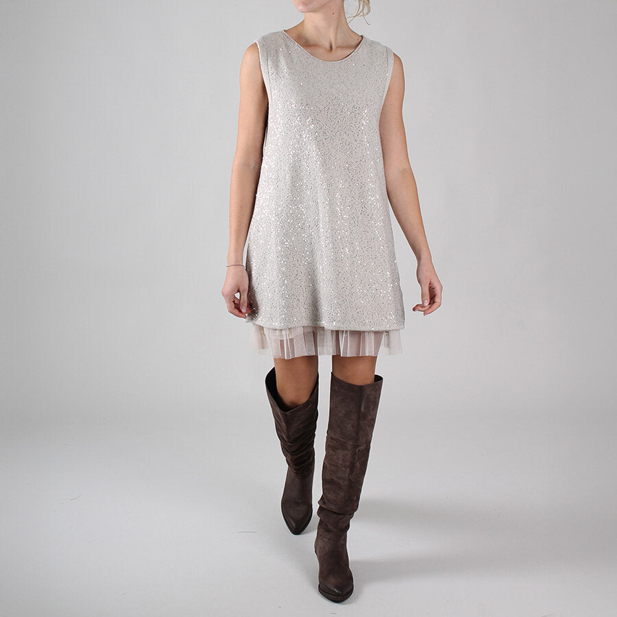L'abito include una sottoveste in tono con finitura in tulle. Lunghezza sopra il ginocchio.