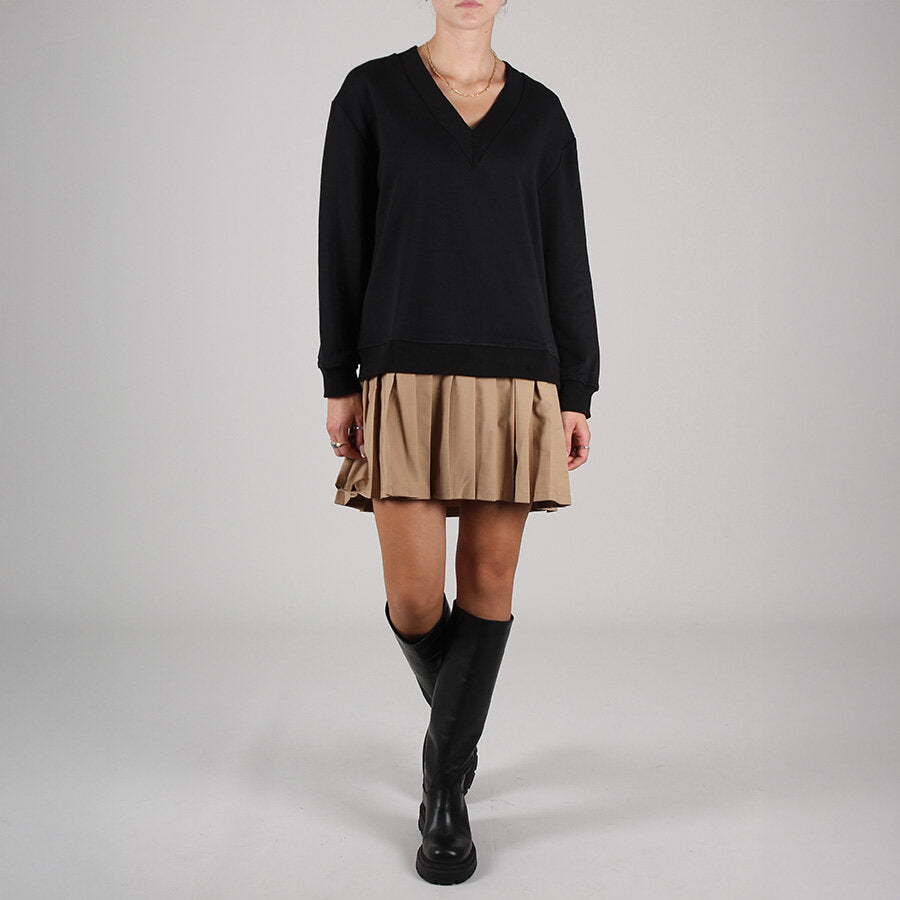 Abito in felpa con gonna plissè attaccata. Stesa vestibiltà dell'abito Parigi ma con il dettaglio dello scollo a V.