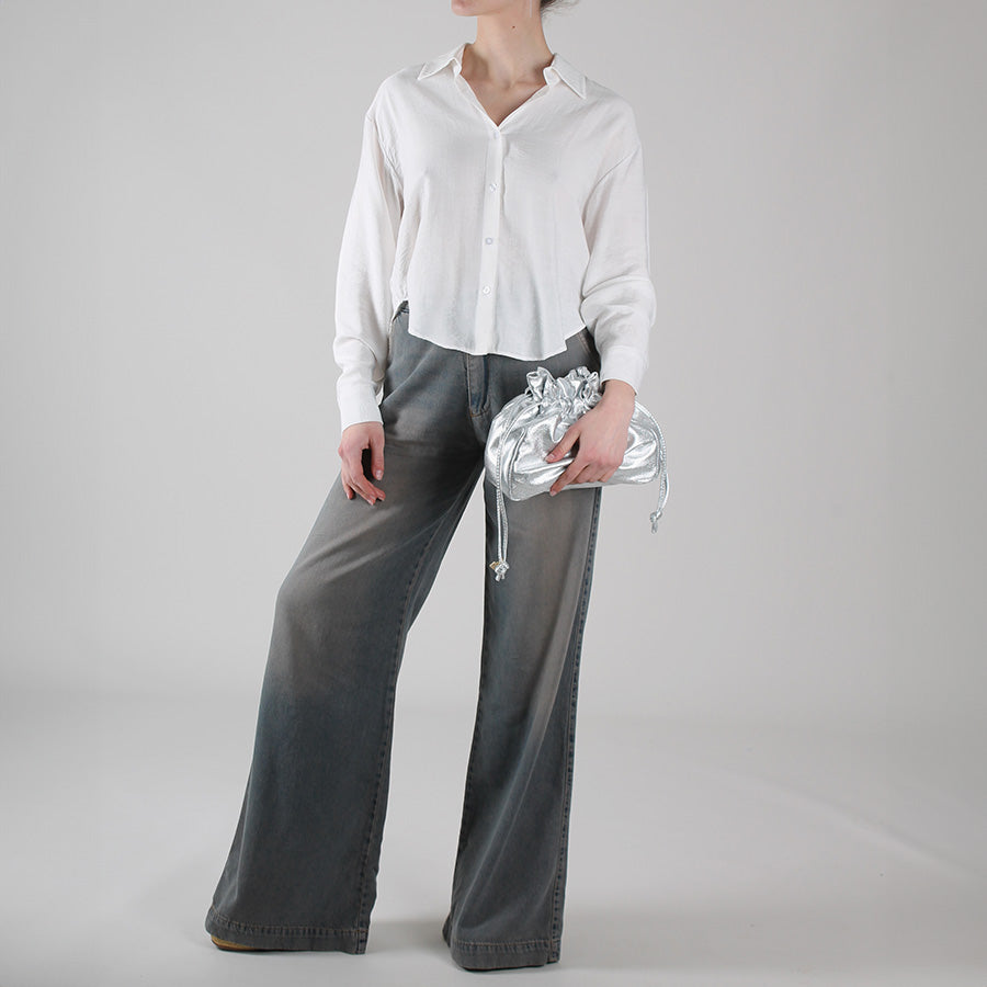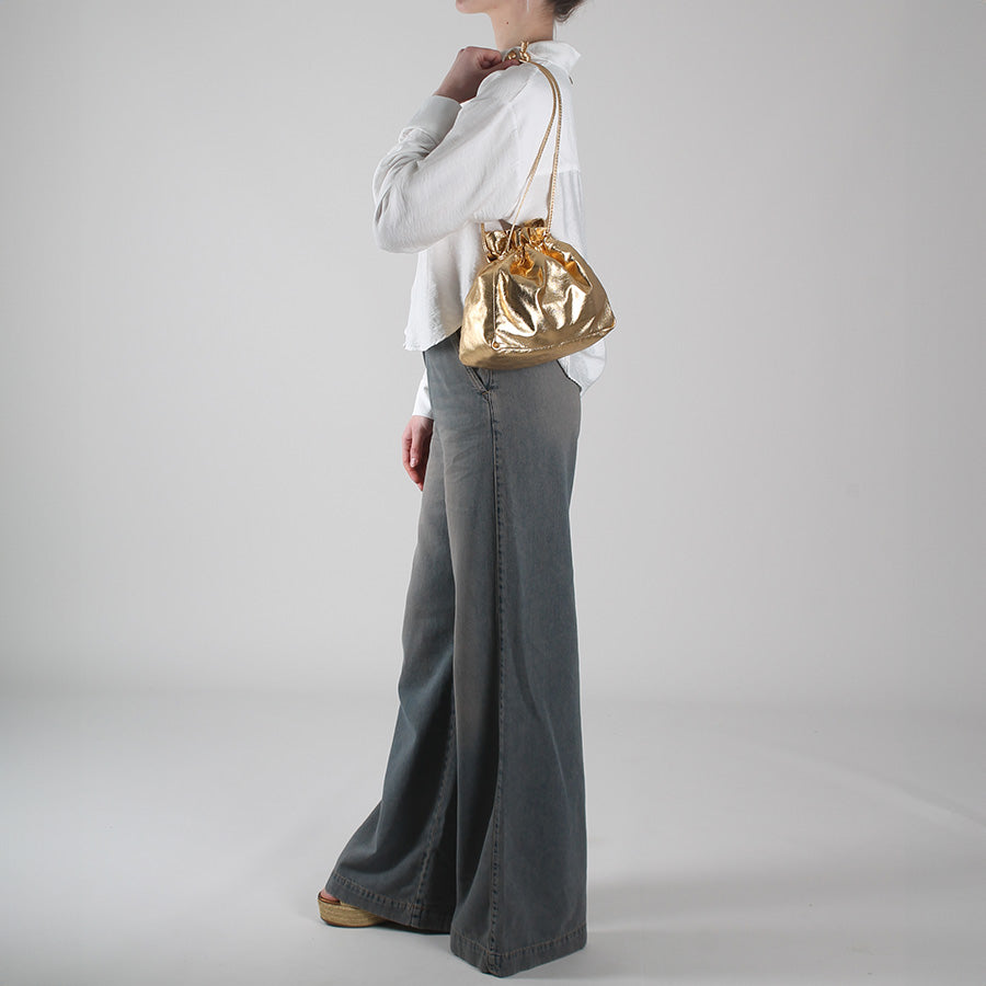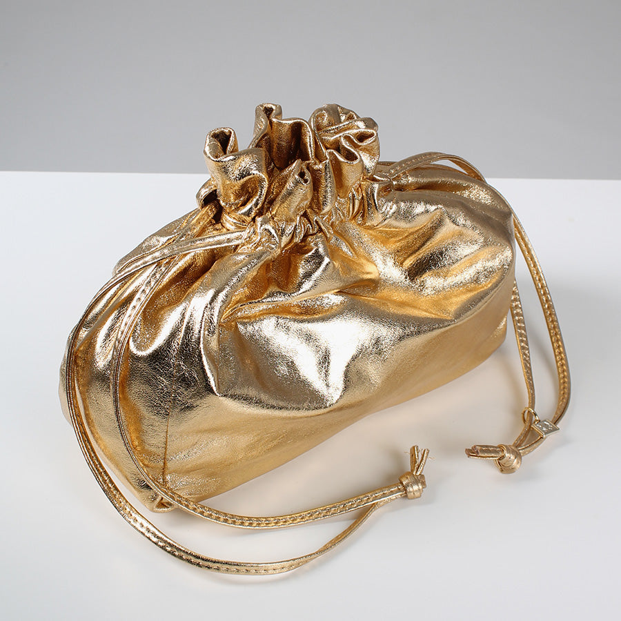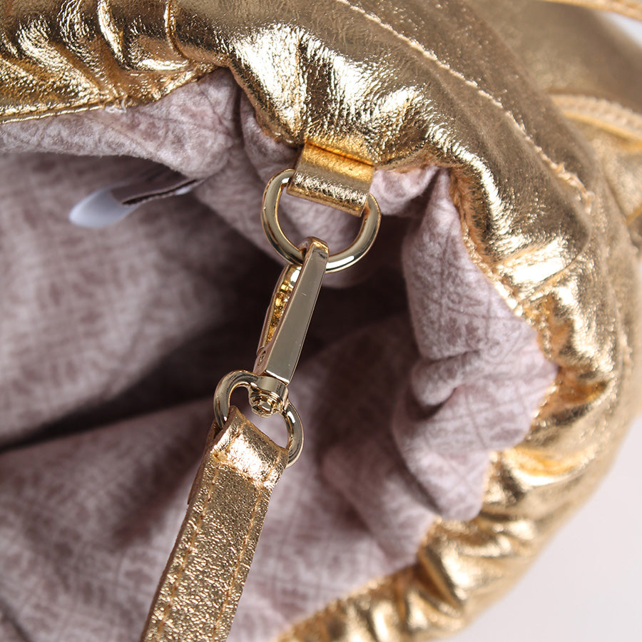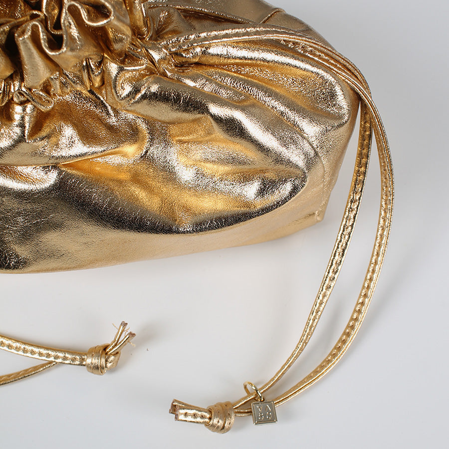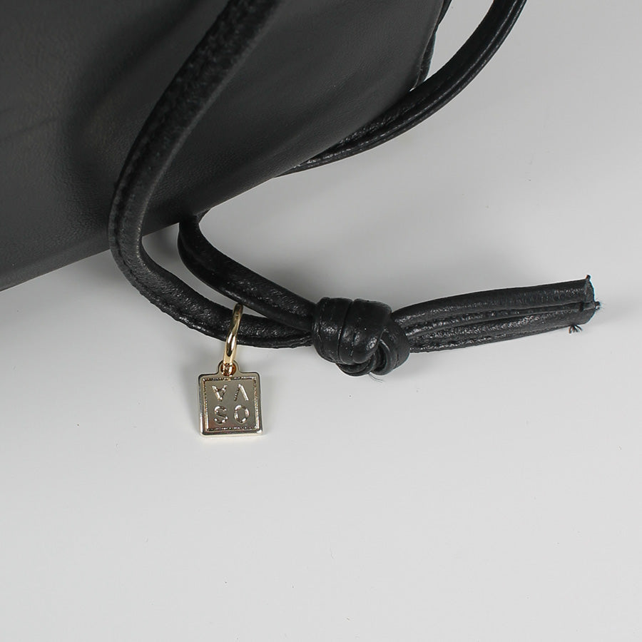 Borsa a secchetto in pelle, chiusura a culisse che crea un effetto drappeggiato. Interno foderato con logo personalizzato e tasca con zip. Tracolla regolabile.