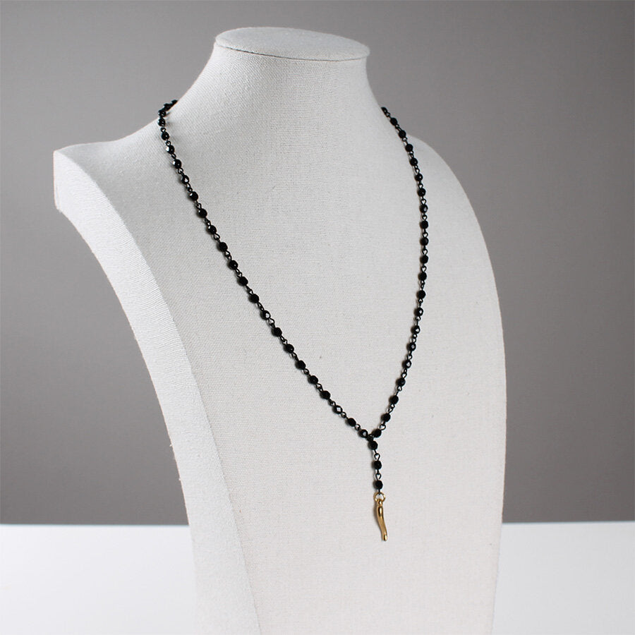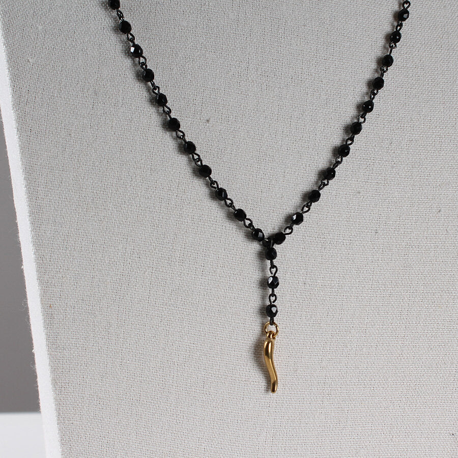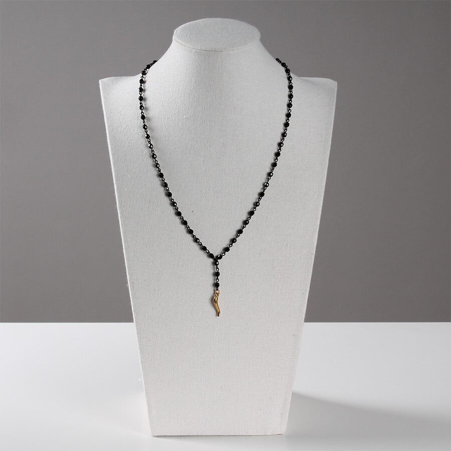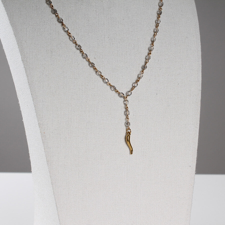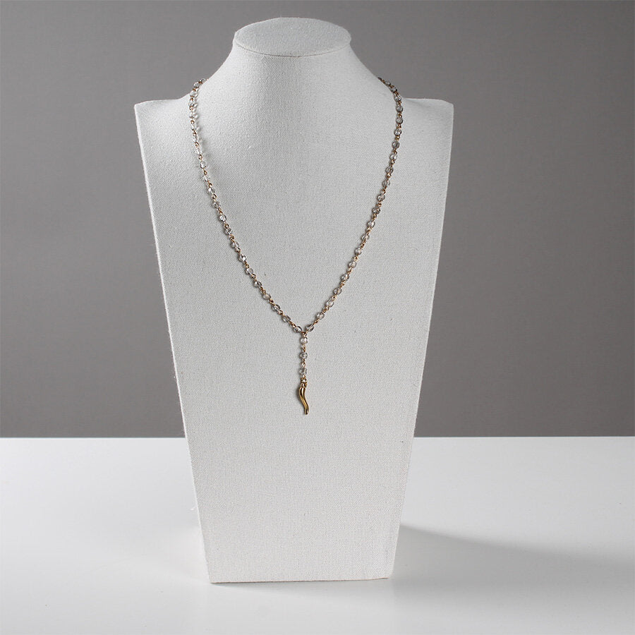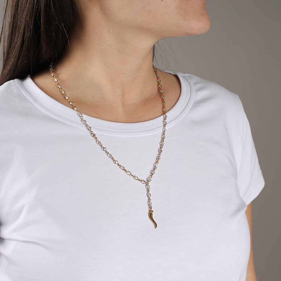 Collana in acciaio con cristalli e ciondolo cornetto.