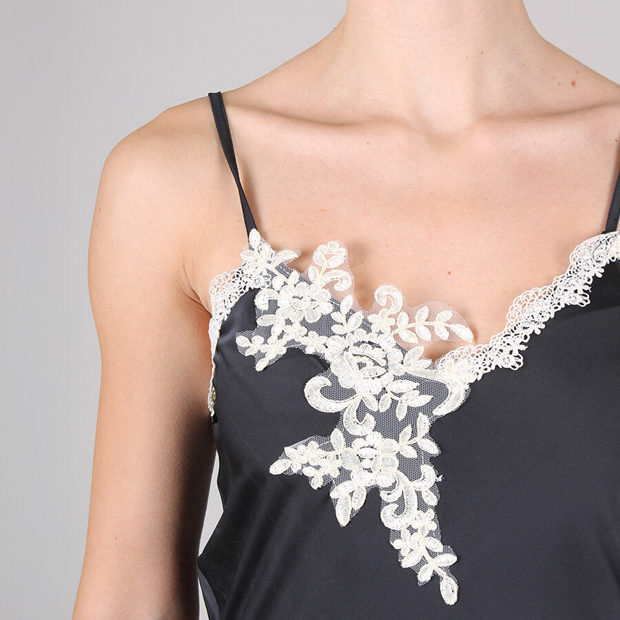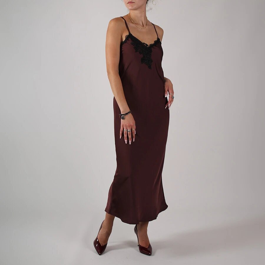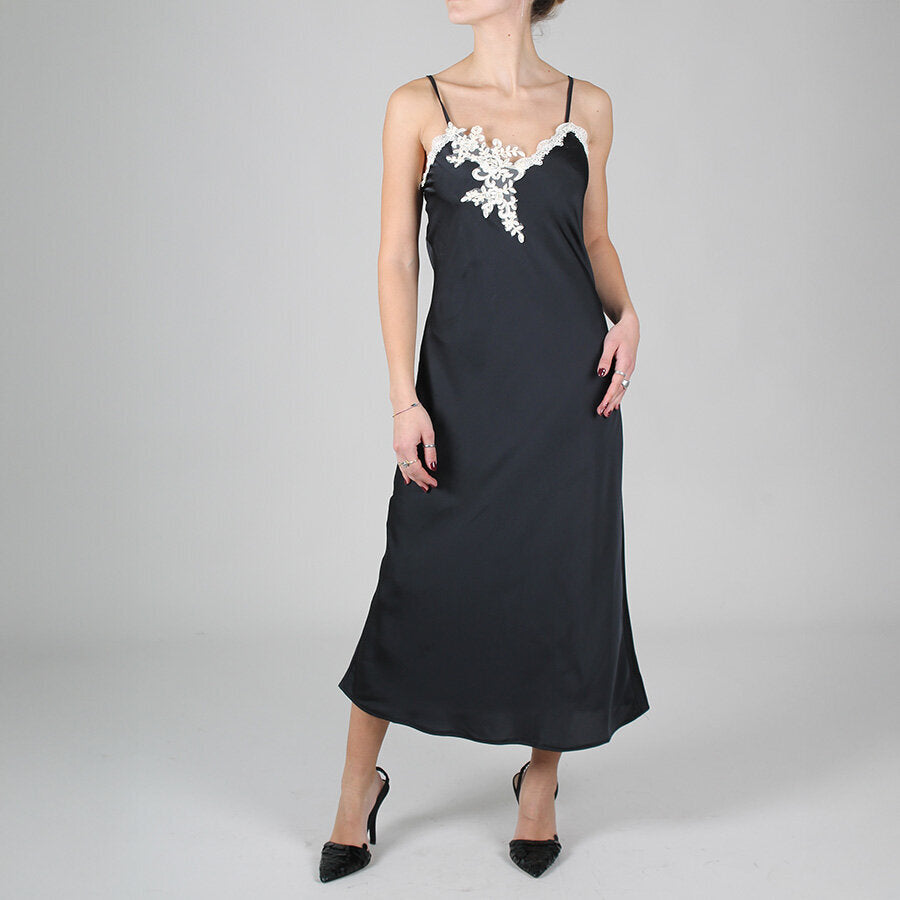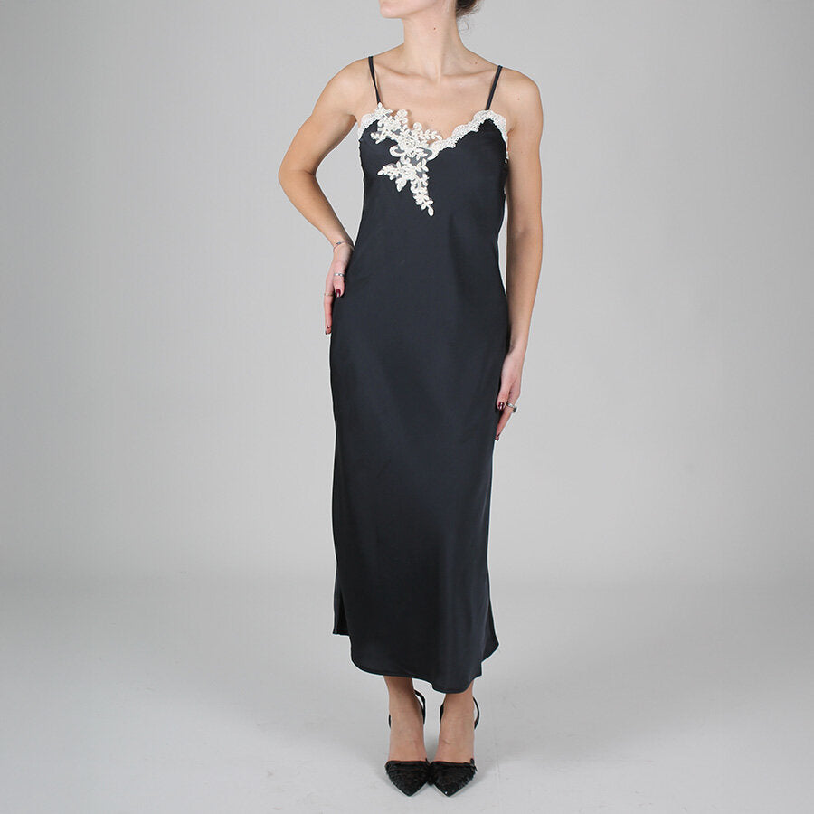 Abito sottoveste con inserti in pizzo prezioso sul decolletè e scollo a V.