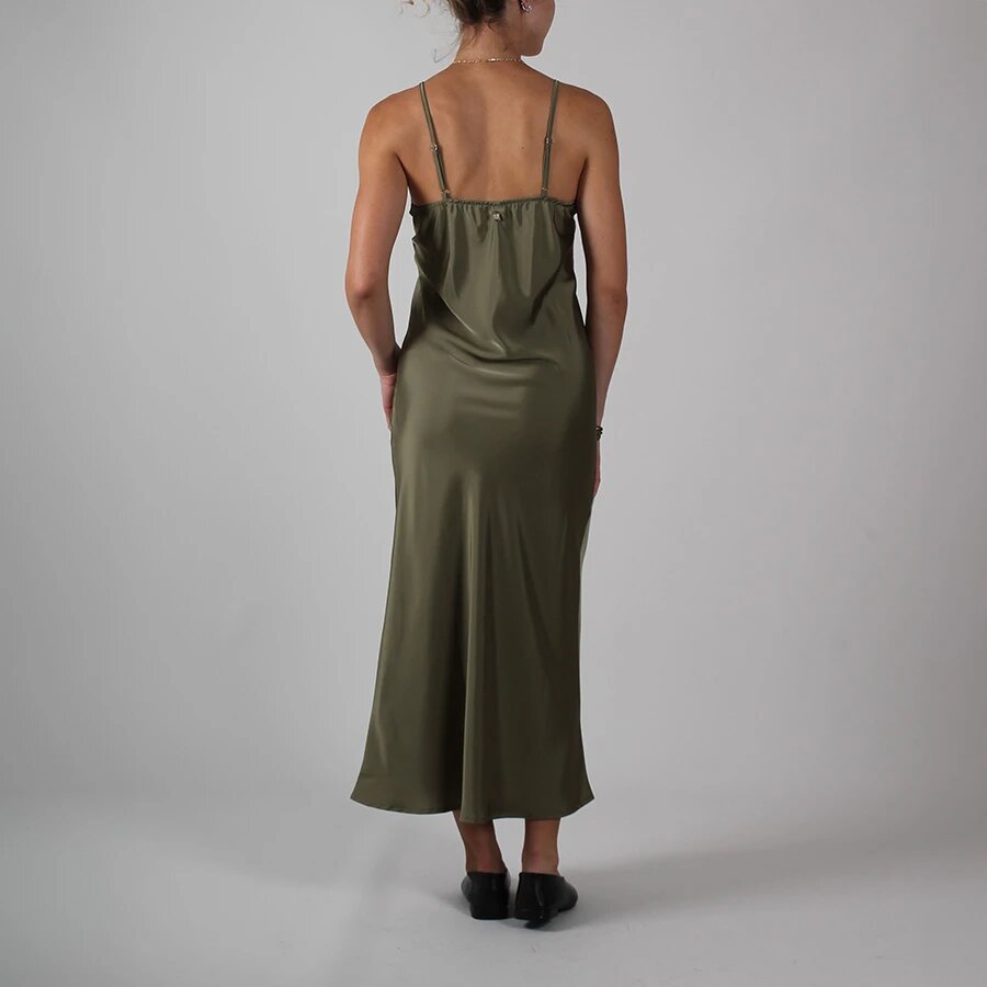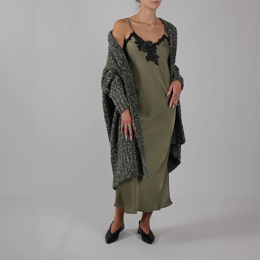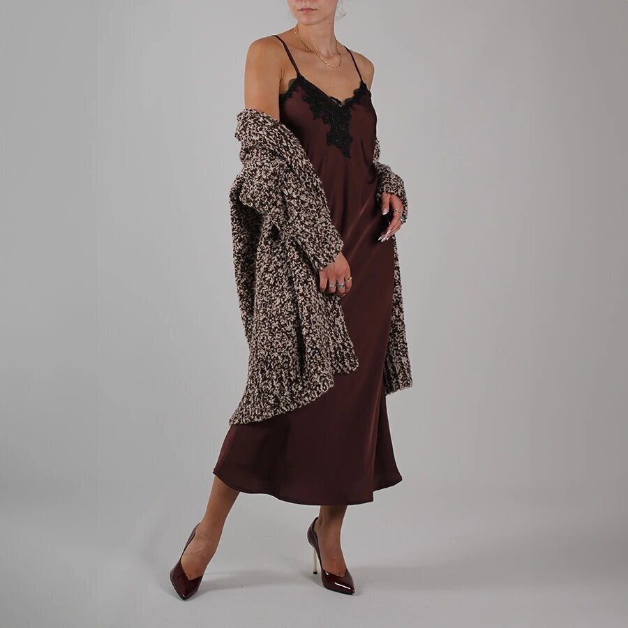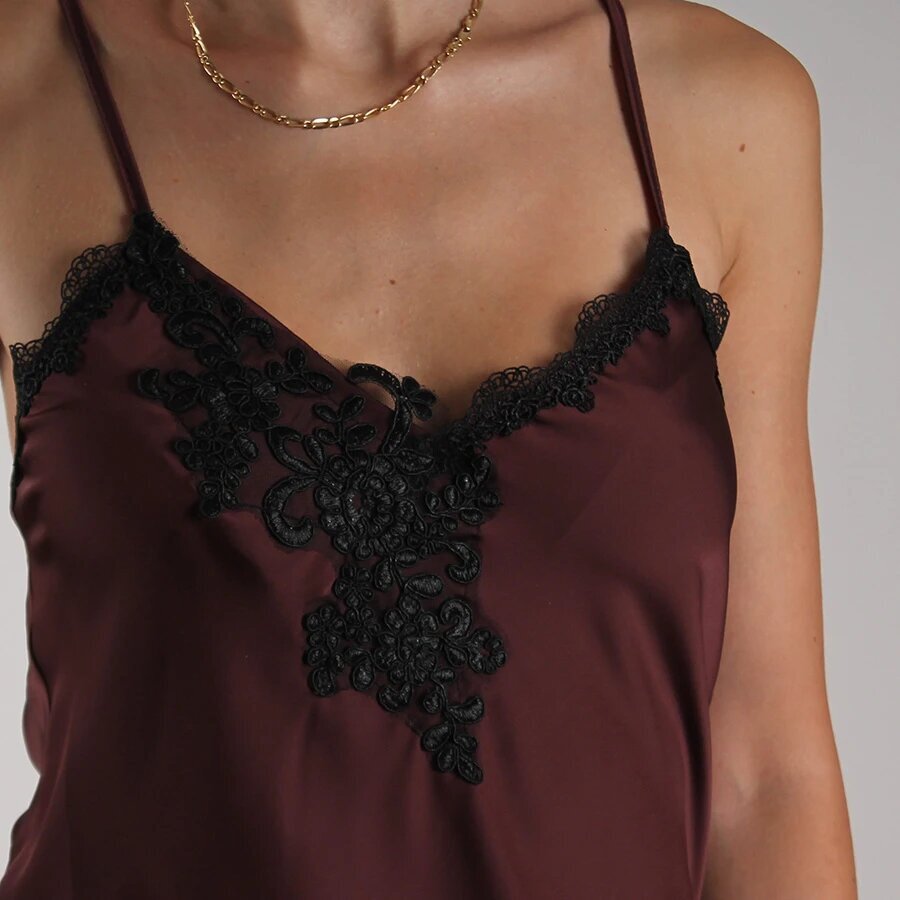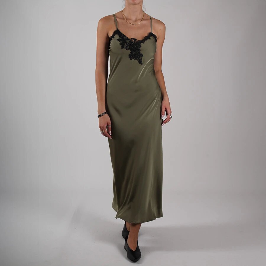 Abito sottoveste con inserti in pizzo prezioso sul decolletè e scollo a V.