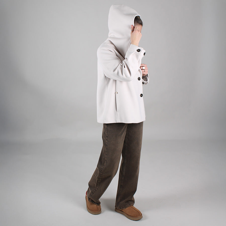 Chiusura con bottoni e cappuccio ampio e avvolgente.