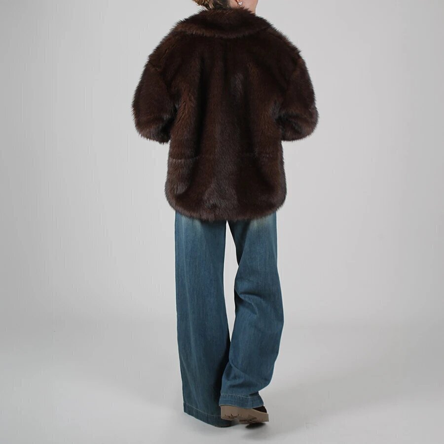 Pellicciotto corto in ecopelliccia, collo ampio e avvolgente, chiusura frontale con bottone a clip.