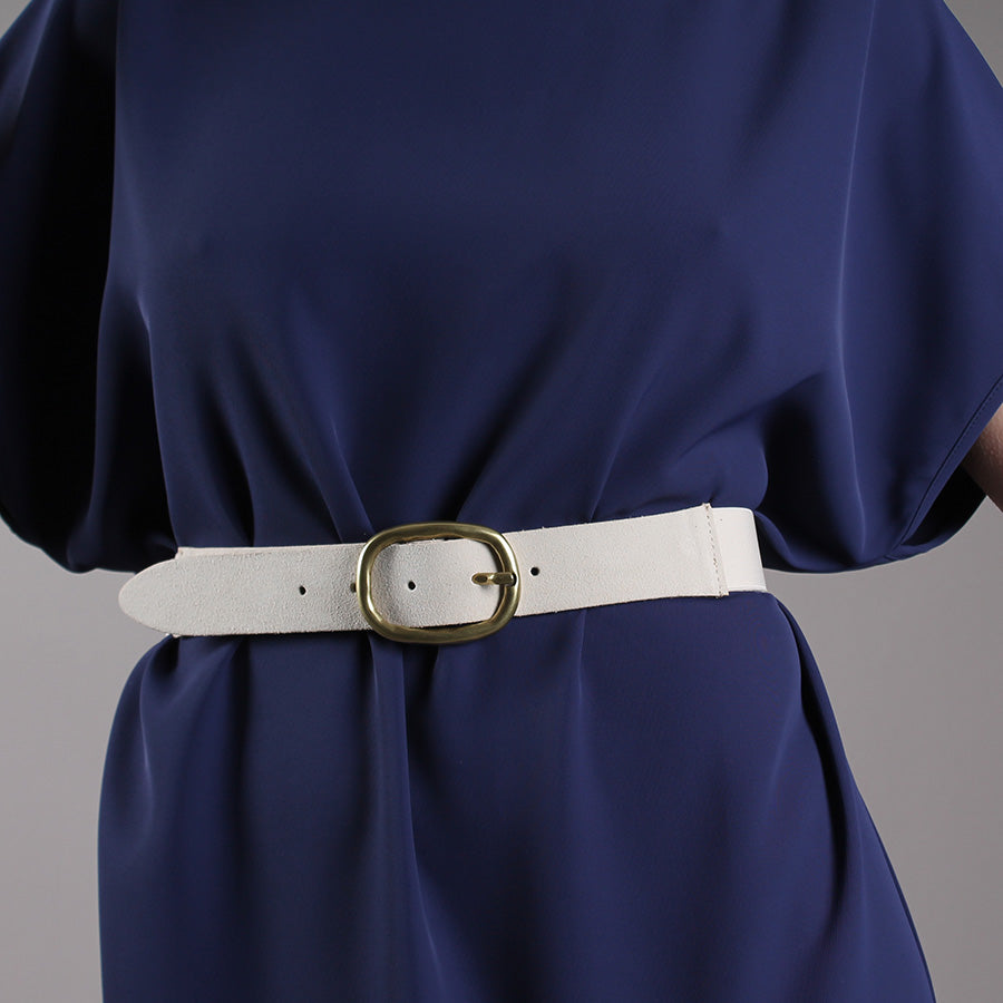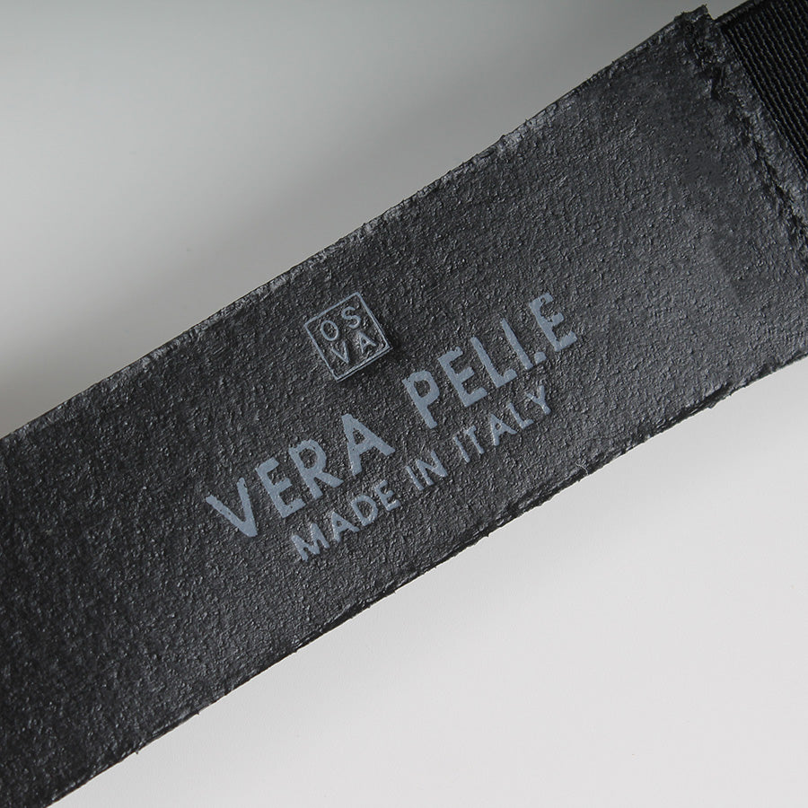 Cintura in pelle ed elastico, fibbia in metallo ovale color ottone.