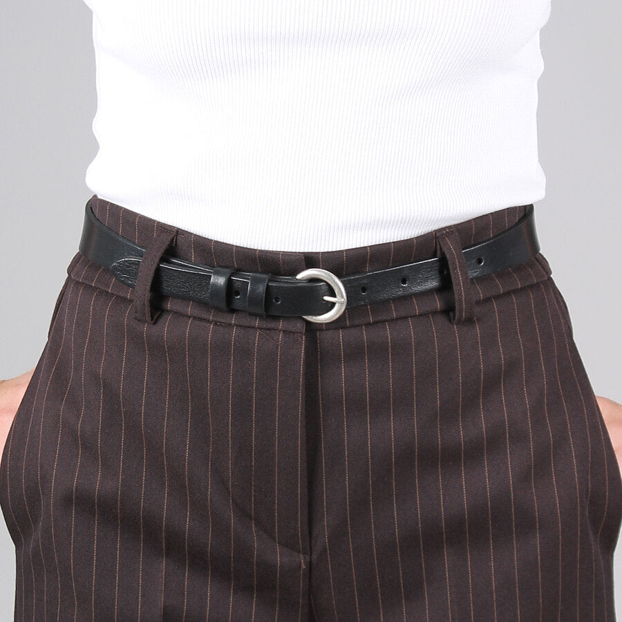 Cintura in pelle con fibbia metallica argento.