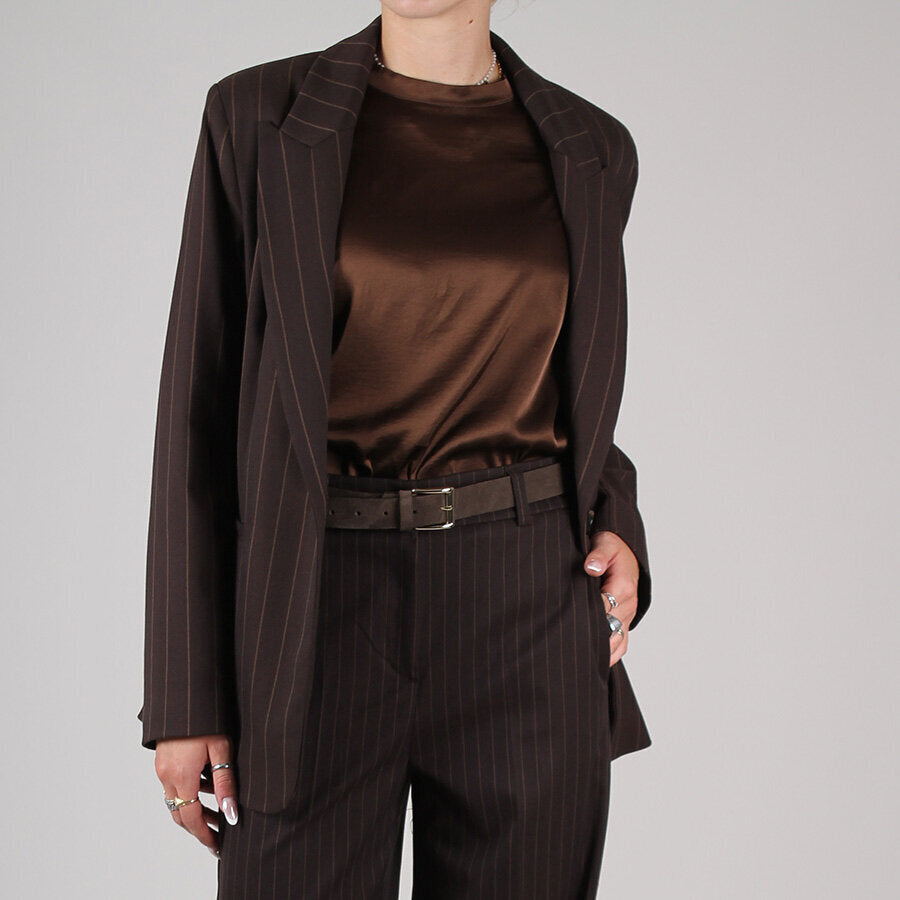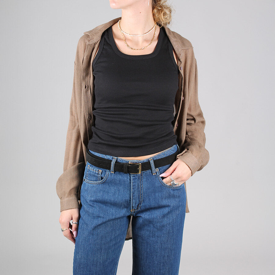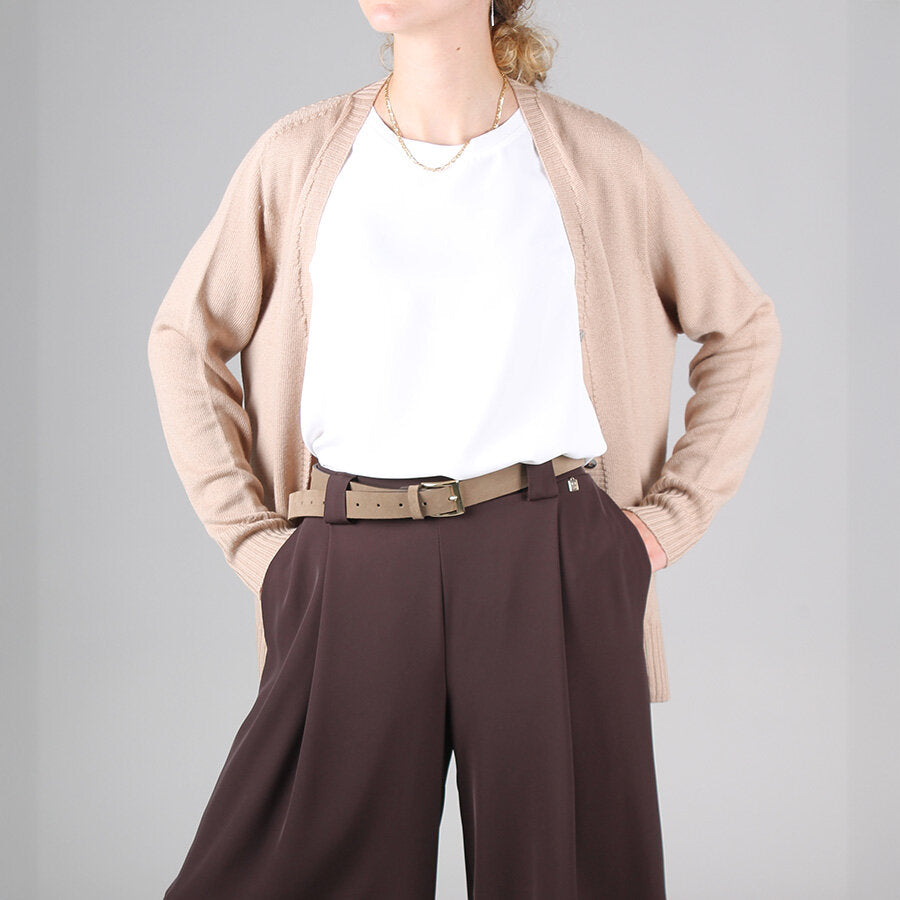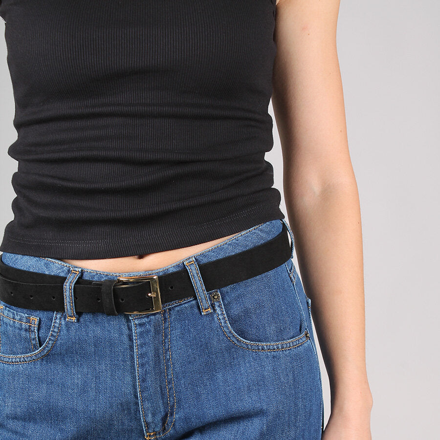 Cintura in cuoio scamoscciato. Fibbia in metallo oro.