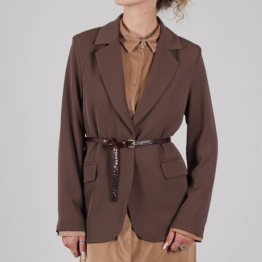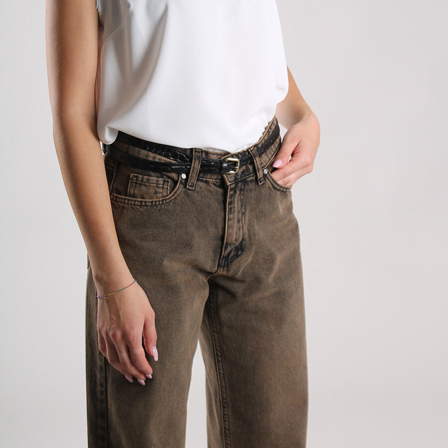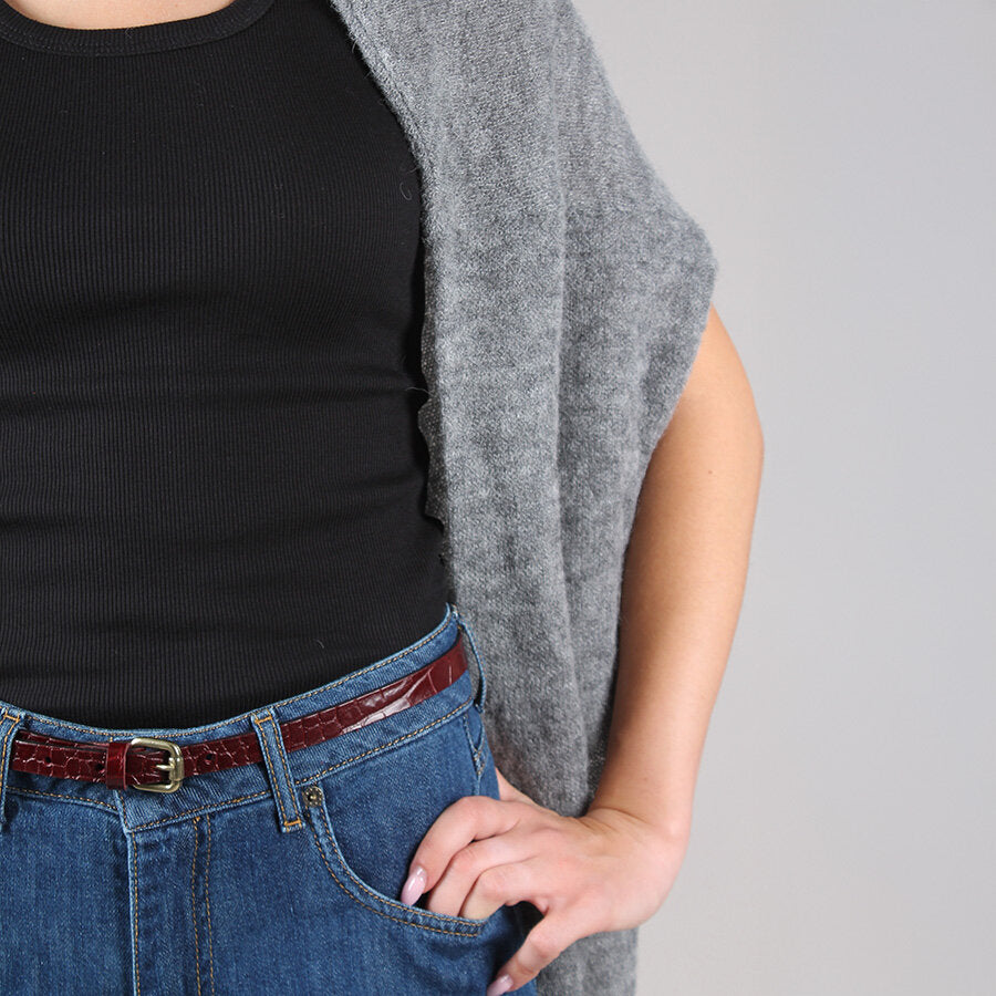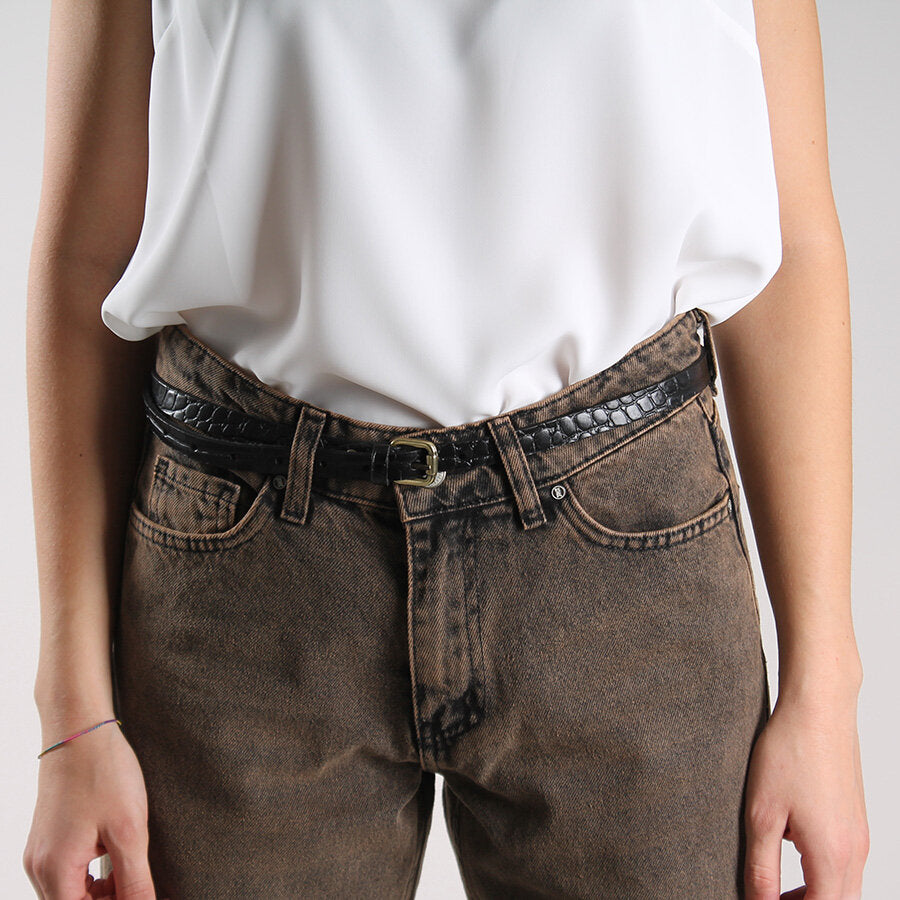 Cintura sottile in cuoio effetto coccodrillo. Fibbia oro.