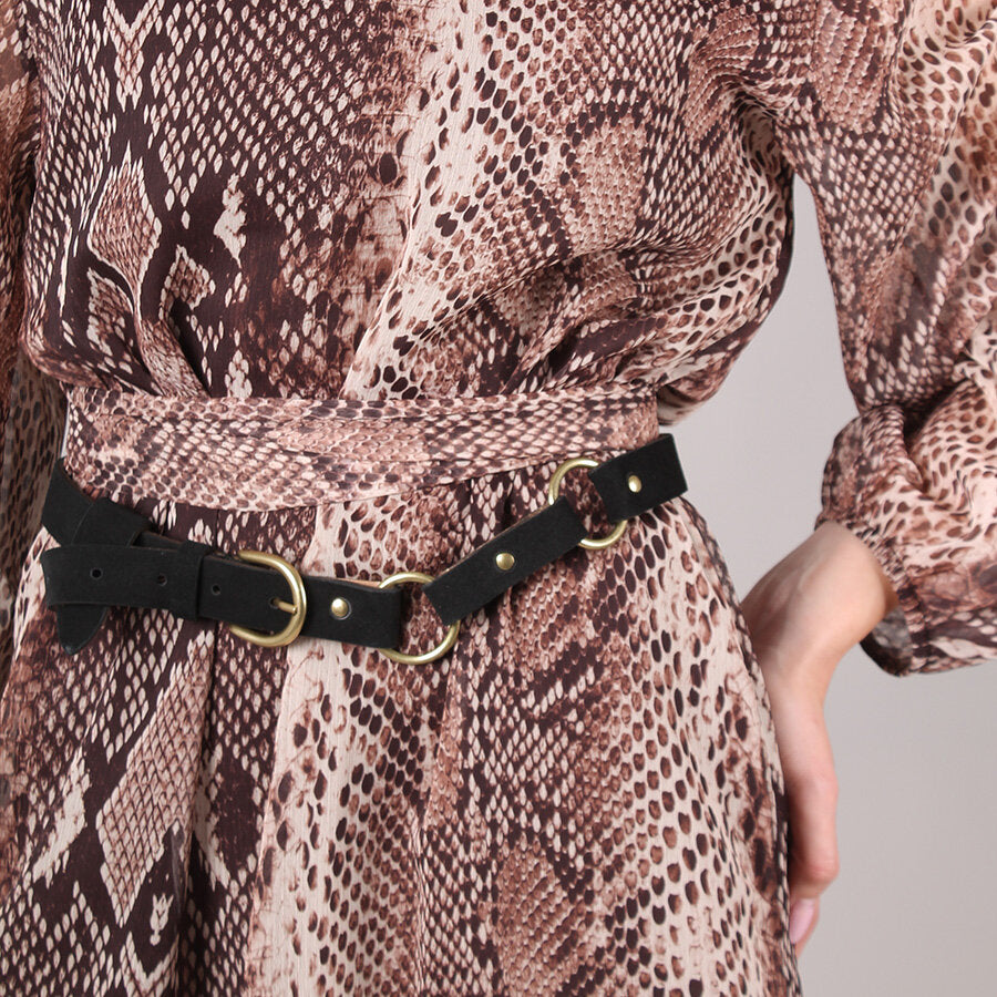 Cintura in pelle scamosciata. Fibbia in metallo oro e anelli decorativi.