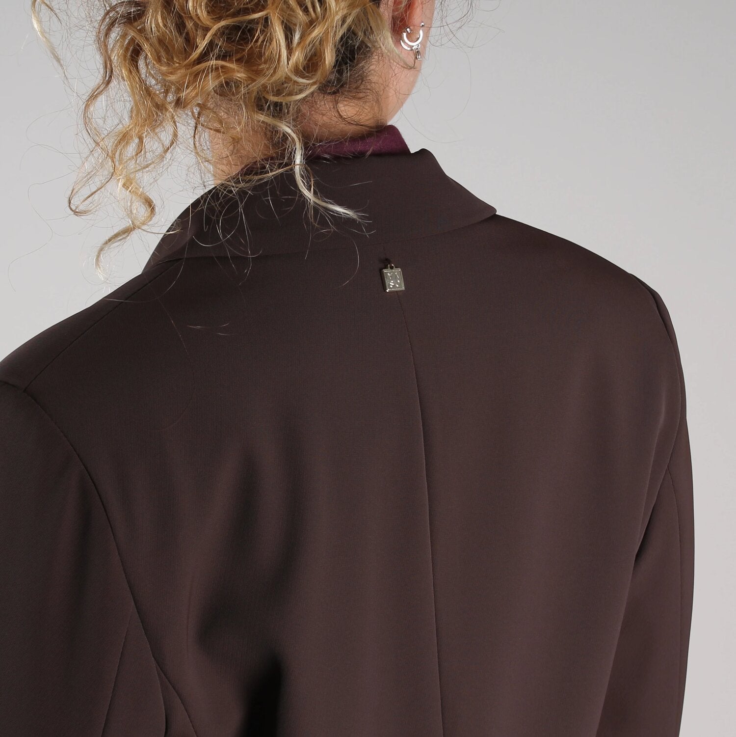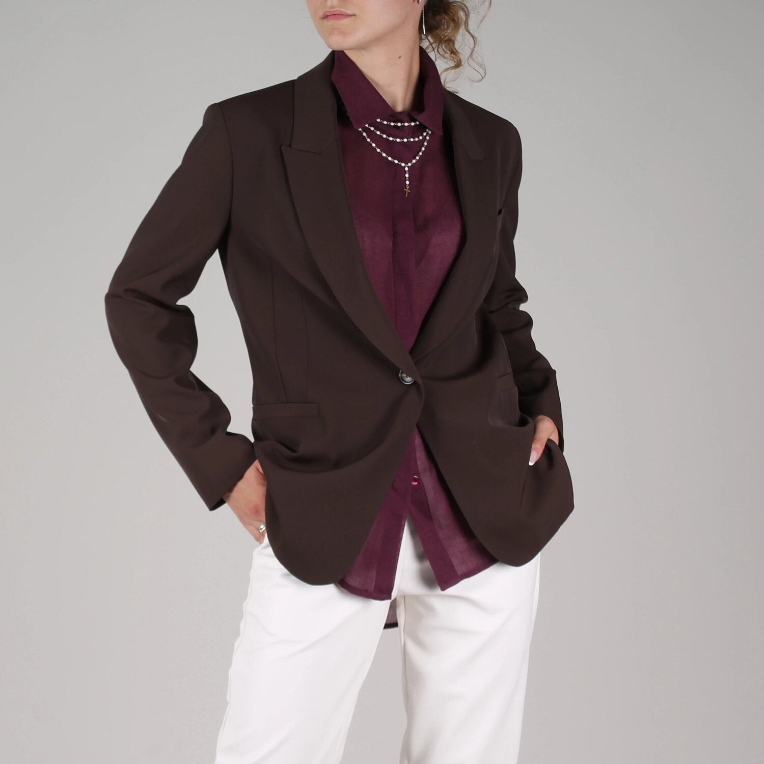 Giacca monopetto modello sartoriale, in tessuto fluido . Revers classico, chiusura con bottone e taschine a filetto.