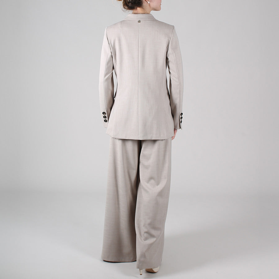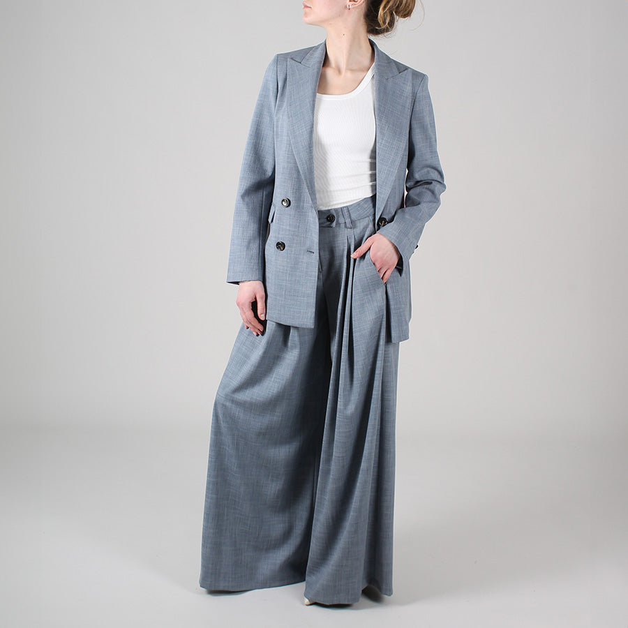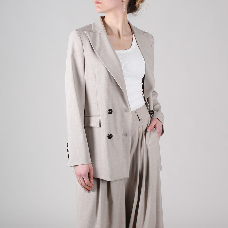 Blazer modello sartoriale, realizzato in tessuto fresco, chiusura doppiopetto con bottoni. Reverse classico, taschine applicate.