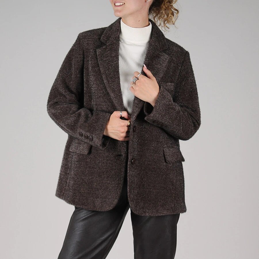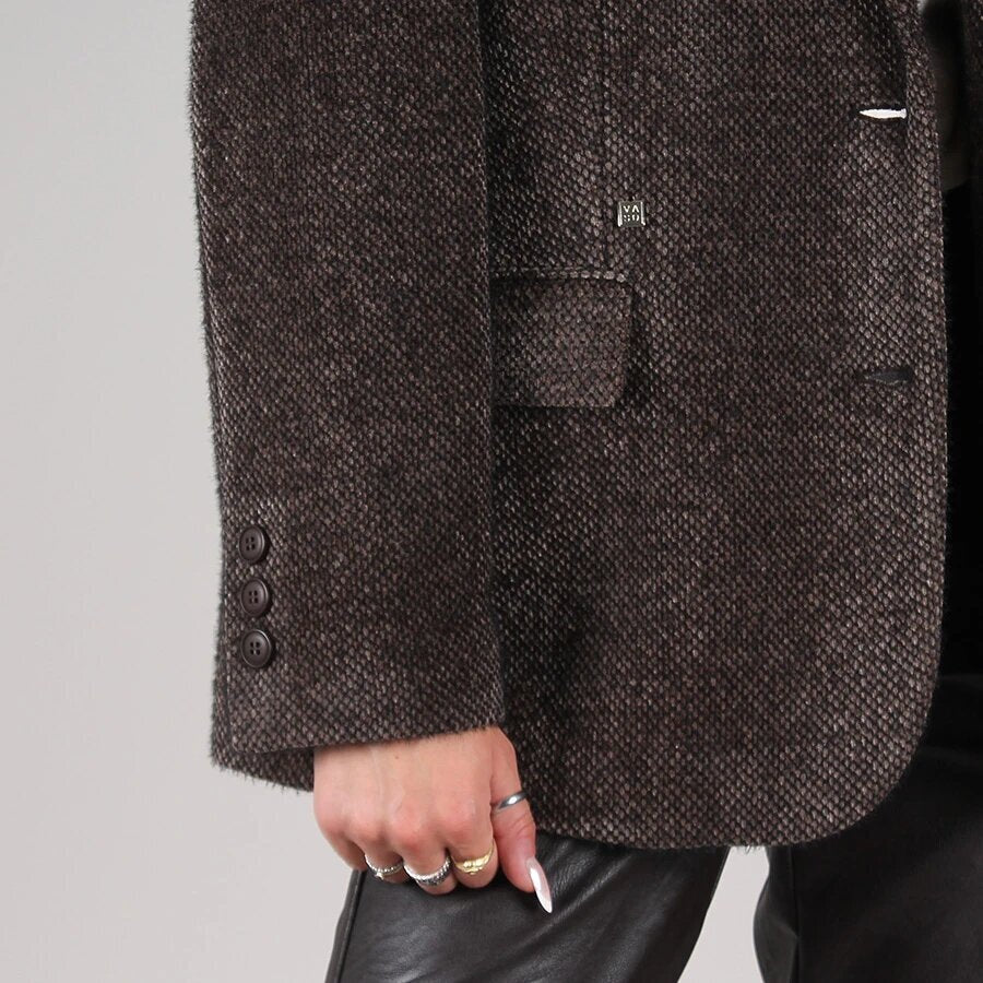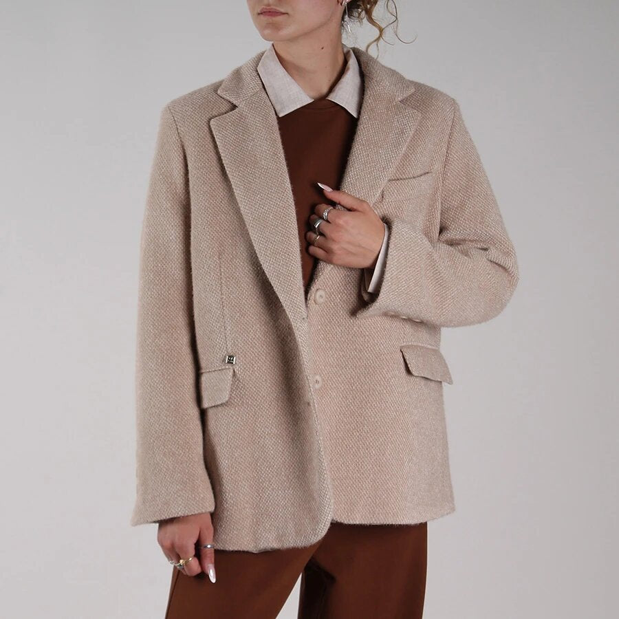 Giacca monopetto in caldo tessuto, revers classico e chiusura con bottoni.