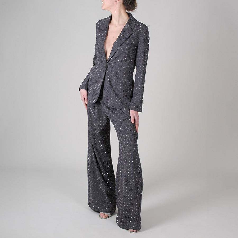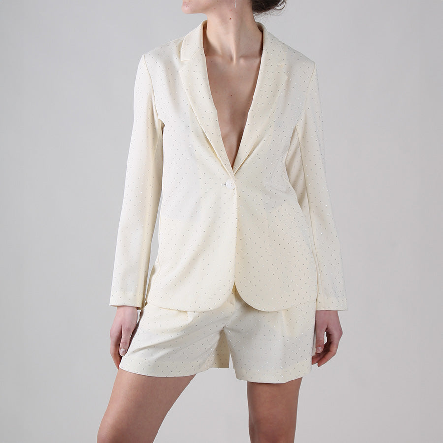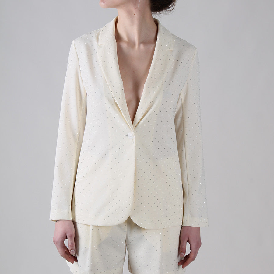Giacca in viscosa con applicazioni strass. Realizzata in tessuto fluido e fresco, chiusura con bottone, rever classico.