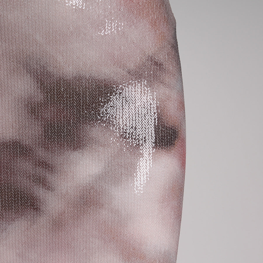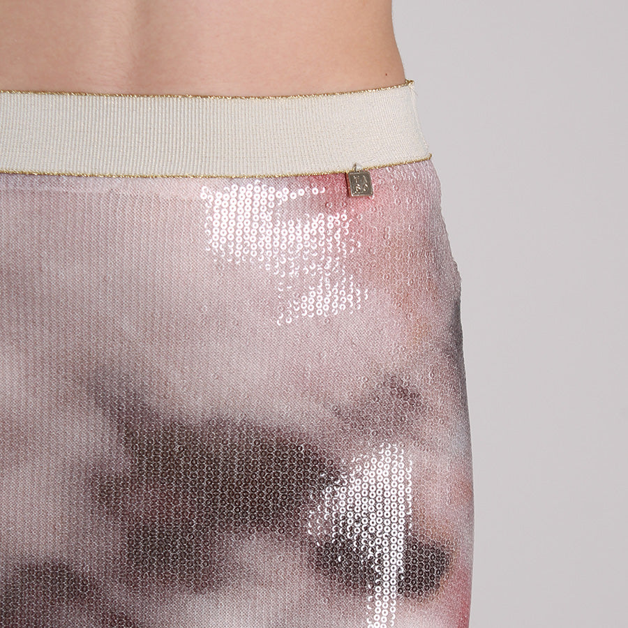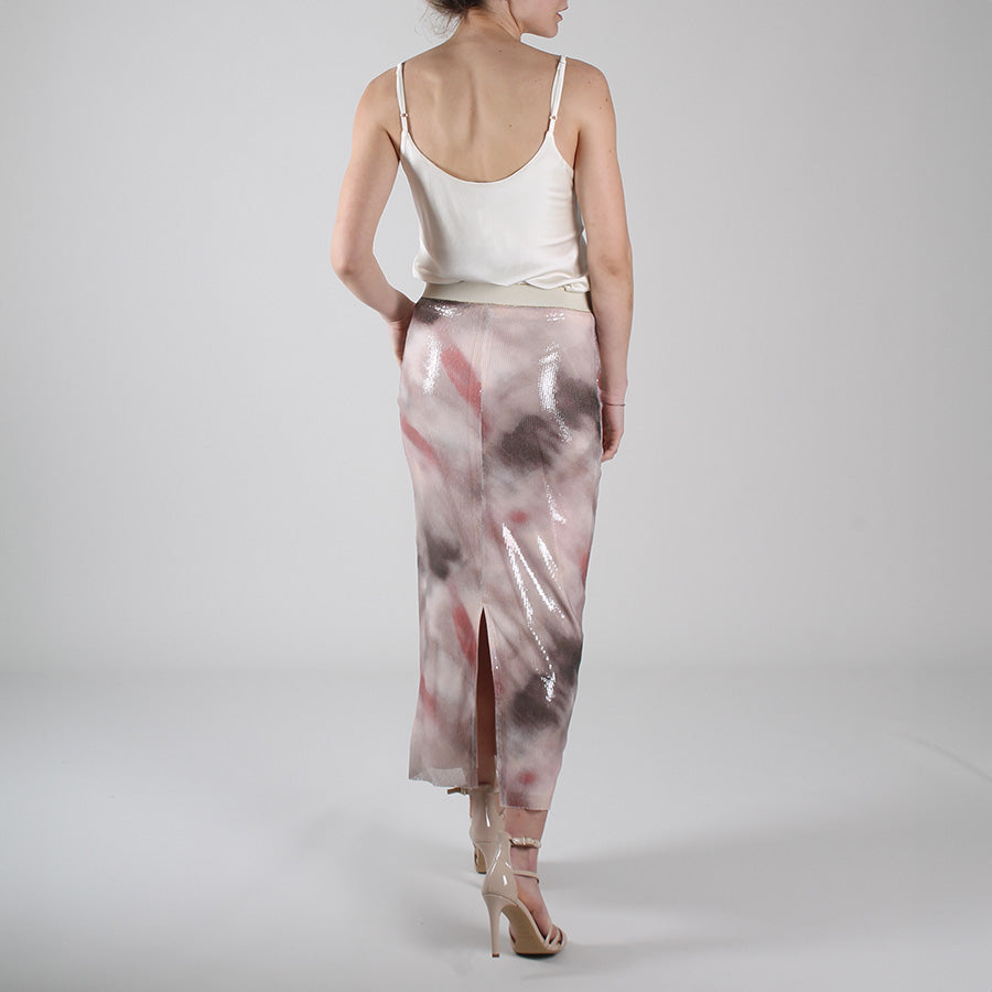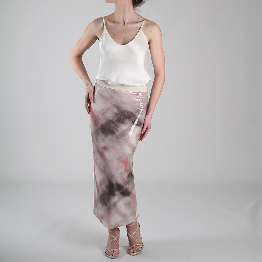 Gonna lunga in tulle e micropaillettes, caratterizzata da una stampa sfumata effetto acquerello. Elastico in vita.