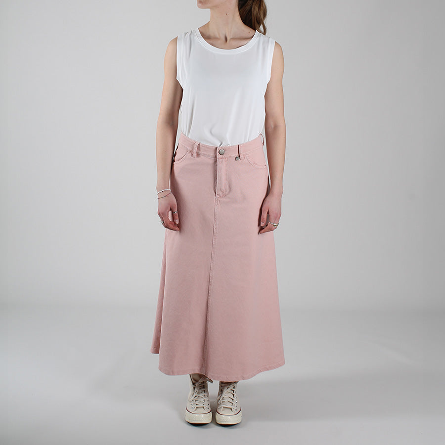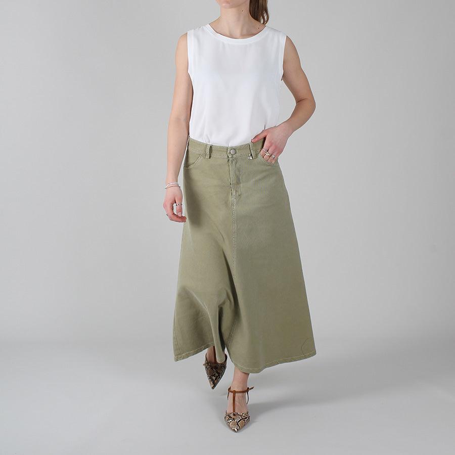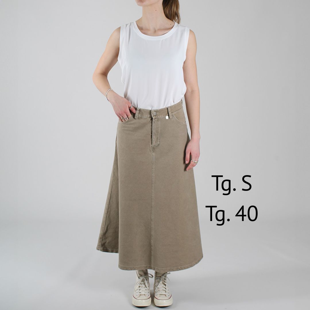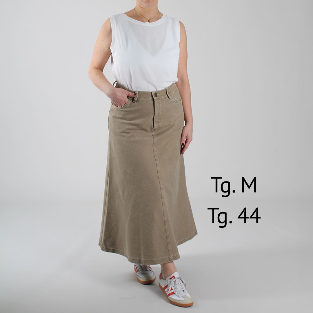 Gonna lunga in denim, linea ampia e svasata. chiusura con bottone e zip, passanti per cintura, tasche laterali e sul retro. Vita regolare.