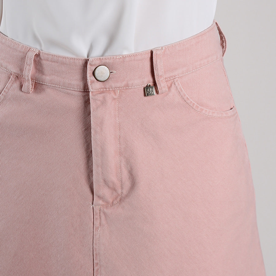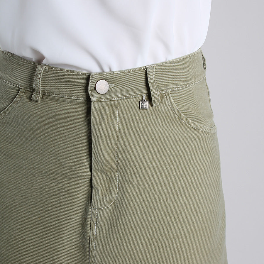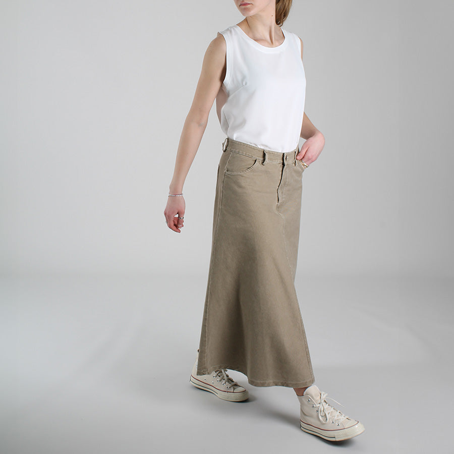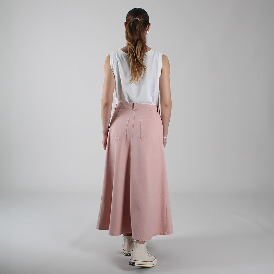 Gonna lunga in denim, linea ampia e svasata. chiusura con bottone e zip, passanti per cintura, tasche laterali e sul retro. Vita regolare.