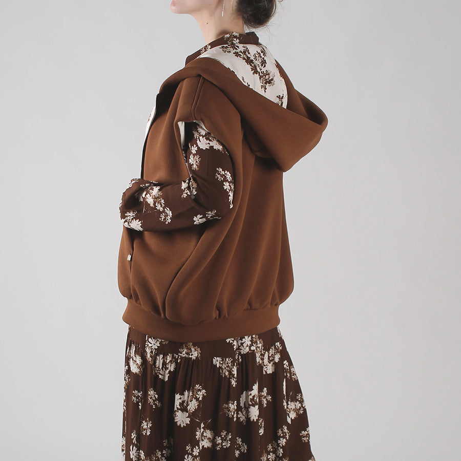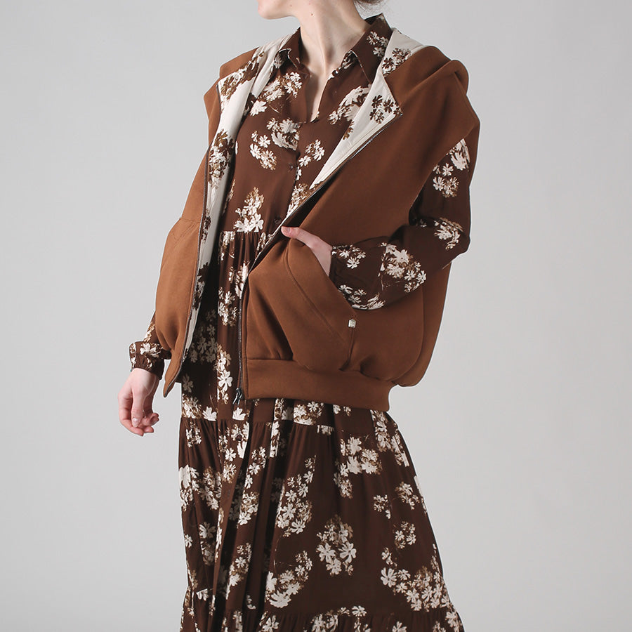 Gilet in felpa con cappuccio, chiusura frontale con zip e tasche . Interno rifinito con fodera in tessuto a stampa floreale.
