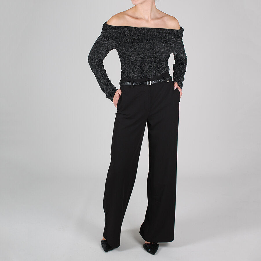 Maglia manica lunga con spalle scoperte elasticizzata con inserti in lurex.