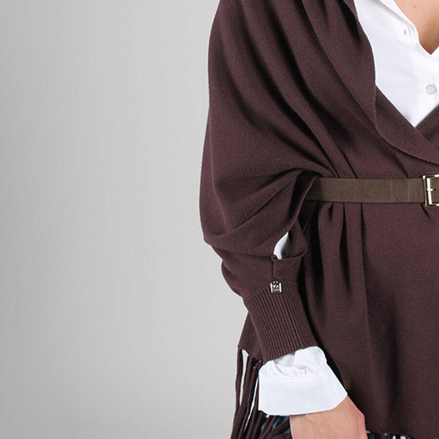 Per indossarlo, basta posizionare l'etichetta dietro al collo e infilare facilmente le maniche: resta fermo sulle spalle e offre la praticità di un cardigan con leleganza di una mantella.