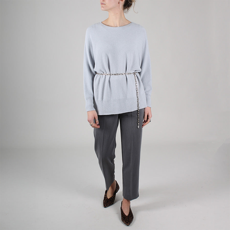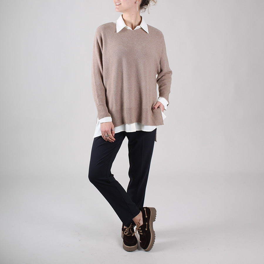 Maglia girocollo in viscosa, più corta sul davanti, con spacchetti laterali.