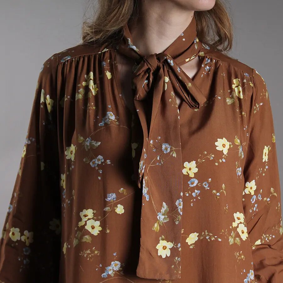 La manica lunga è leggermente arricciata sulla spalla e sul polsino, chiusura con bottoncini.