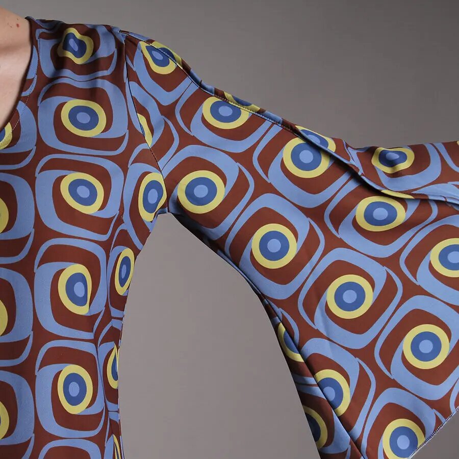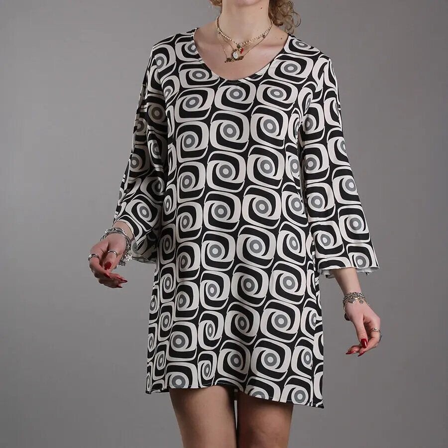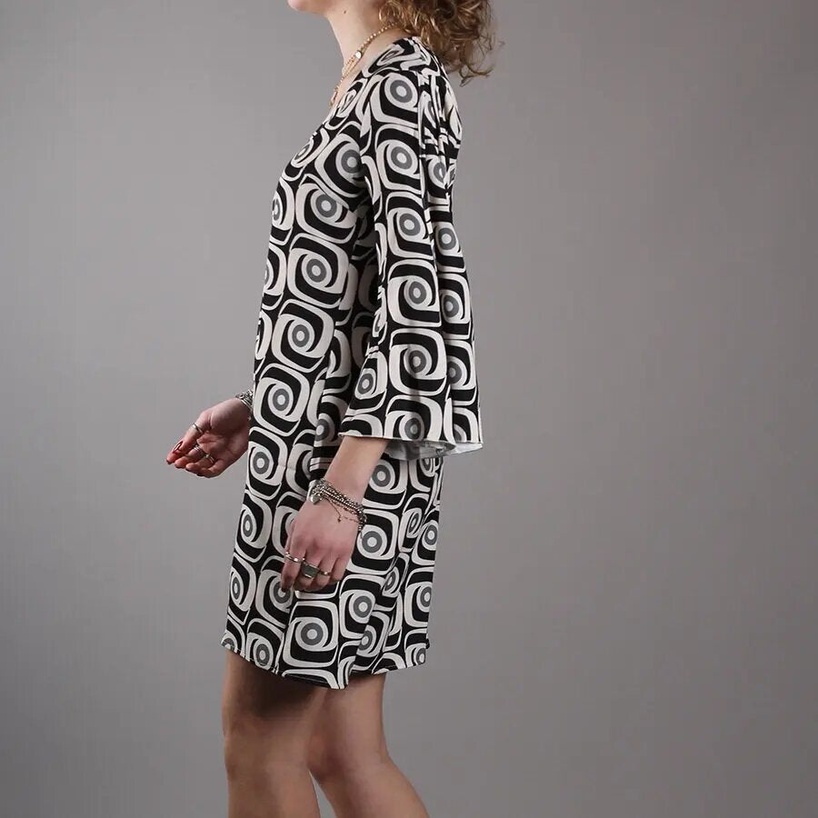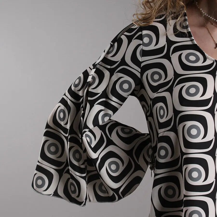 L'abito presenta un design audace e originale grazie alla sua stampa geometrica, composta da motivi a spirale e quadrati concentrici.