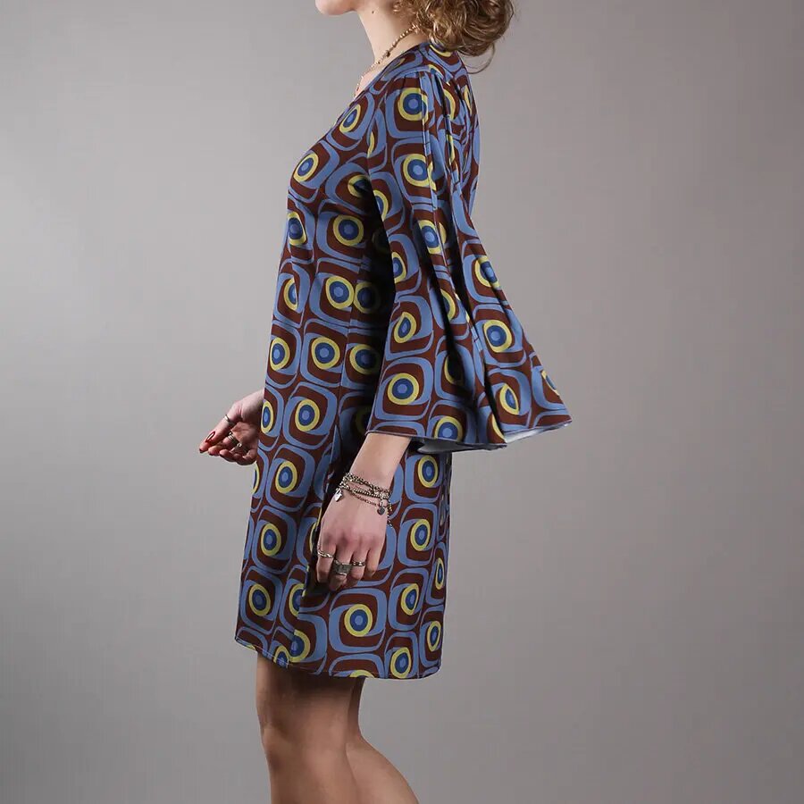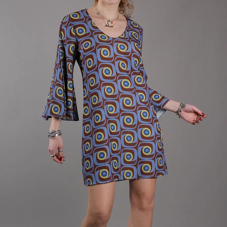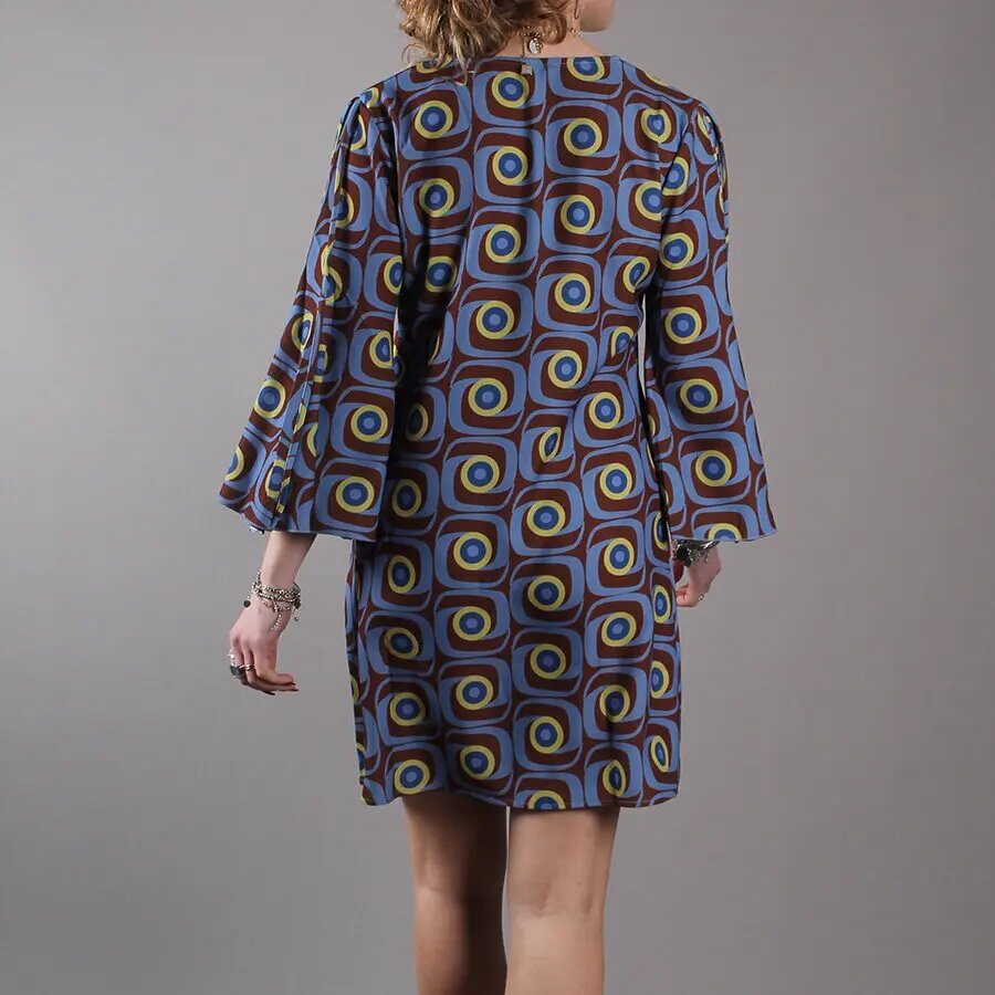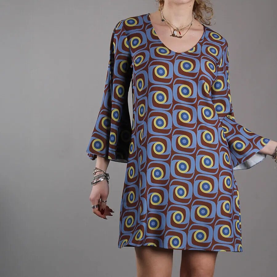 L'abito presenta un design audace e originale grazie alla sua stampa geometrica, composta da motivi a spirale e quadrati concentrici.