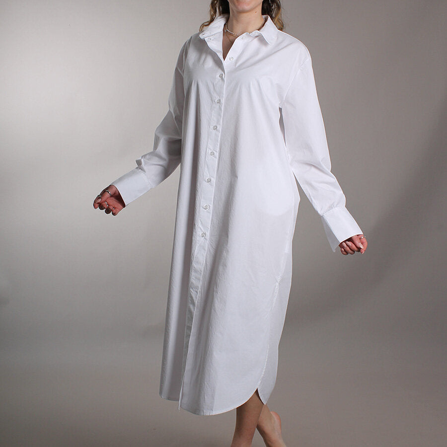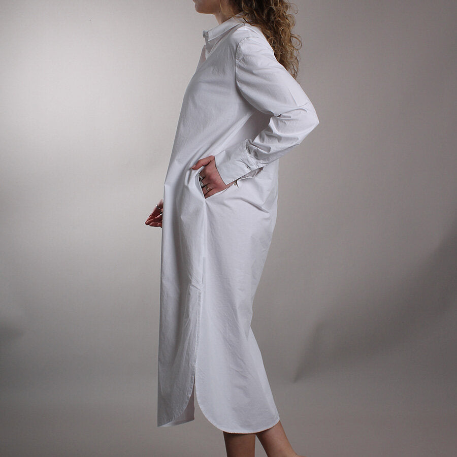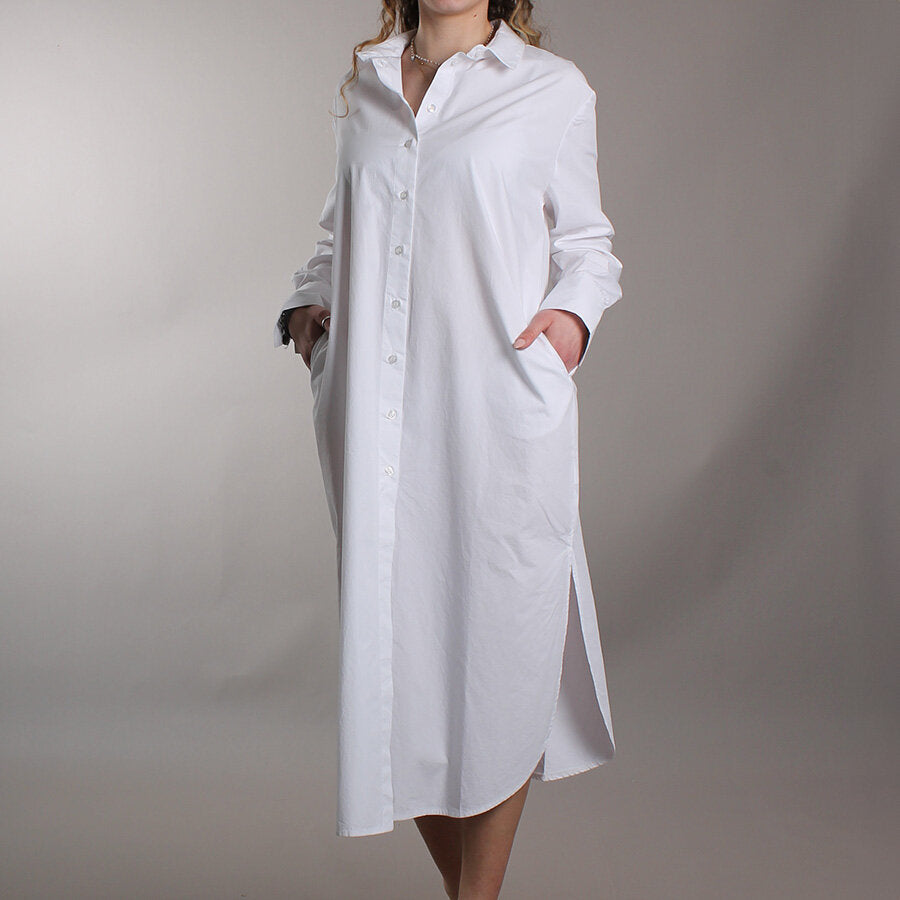 Chemisier in cotone, fresco e leggero. Chiusura a bottoni frontale, tasche laterali, colletto strutturato e maniche lunghe con polsini abbottonati.