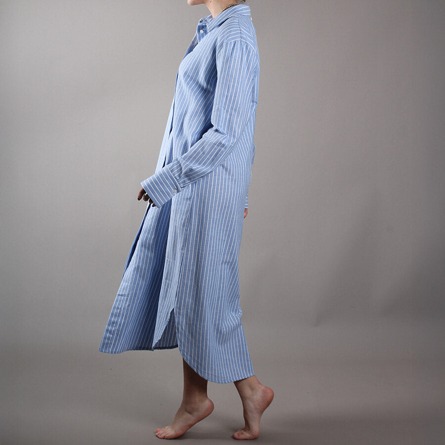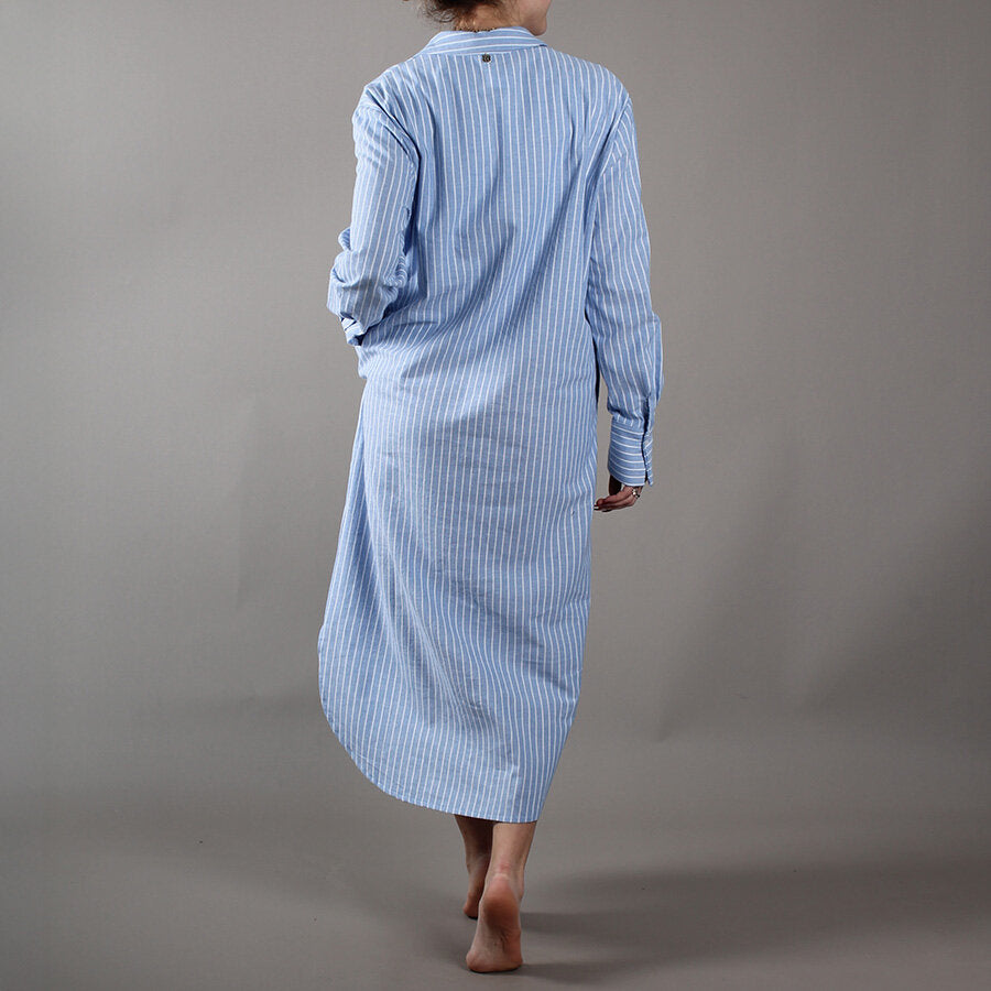 Abito realizzato in cotone, a righe verticali che slanciano la figura. Chiusura a bottoni frontale, tasche laterali, colletto strutturato e maniche lunghe con polsini abbottonati.