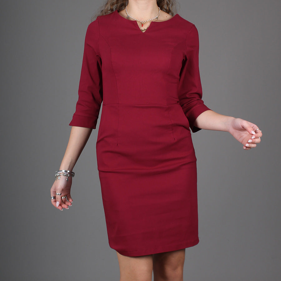 Tubino corto elasticizzato, con manica a tre quarti e taschine sui fianchi, cerniera sul retro.Vestibilità slim.77% Viscosa, 20% Nylon, 3% elastan.Il tubino è disponibile in Nero, Moro o Bordeaux.Il prodotto può essere lavato come delicato a massimo 30°. Non stirare.Lavare separatamente.Prodotto in Italia, distribuito da Vaso srl.