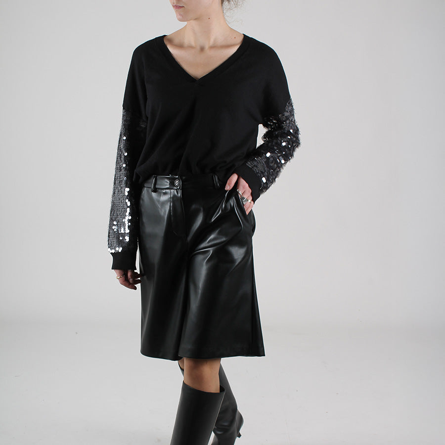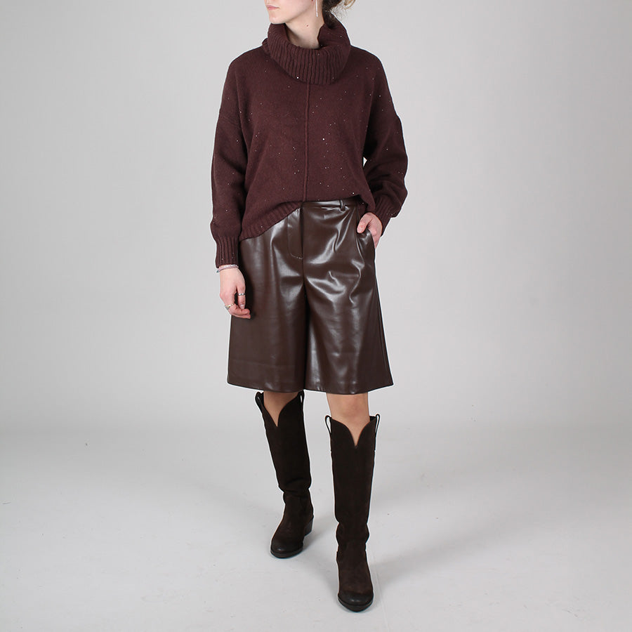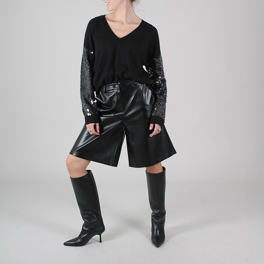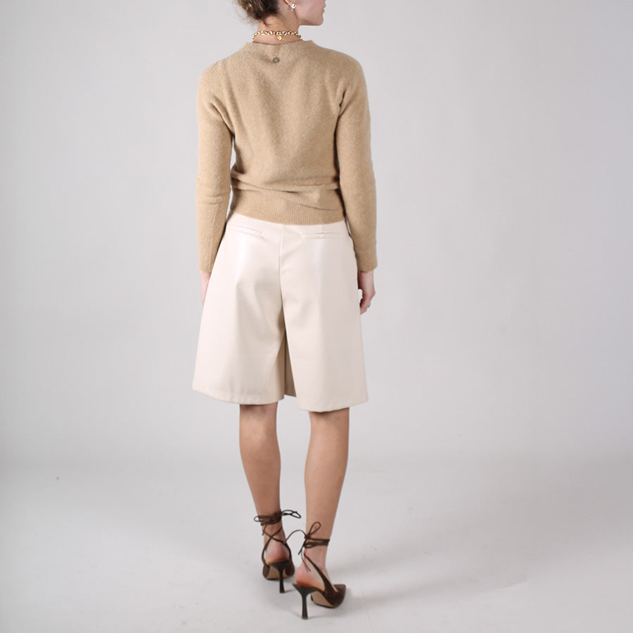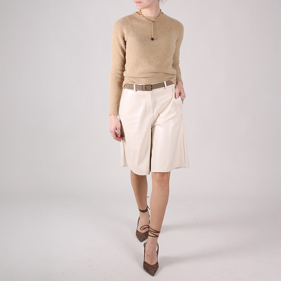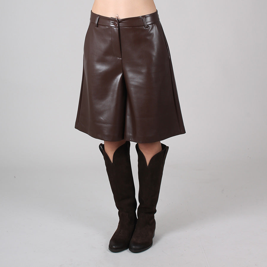 Bermuda in ecopelle, chiusura con bottone e zip. Passanti per cintura.