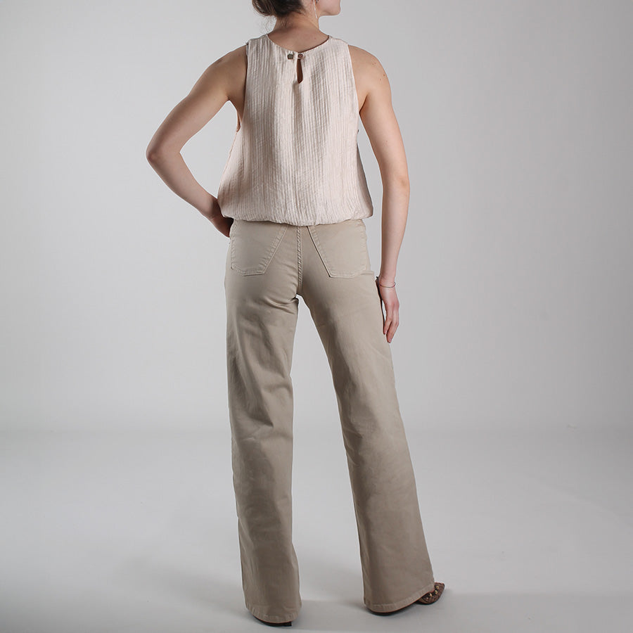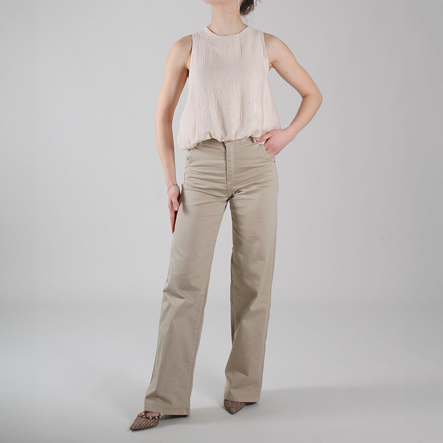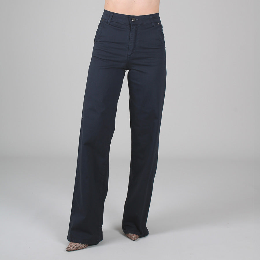 Jeans in cotone elasticizzato dalla vestibilità asciutta, a vita alta e gamba ampia. Tasche laterali e sul retro, chiusura con bottone e zip e passanti per cintura.
