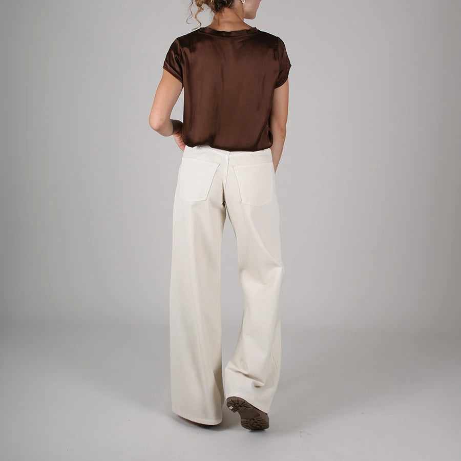 Jeans a palazzo, chiusura con bottone e zip. Tasche posteriori.