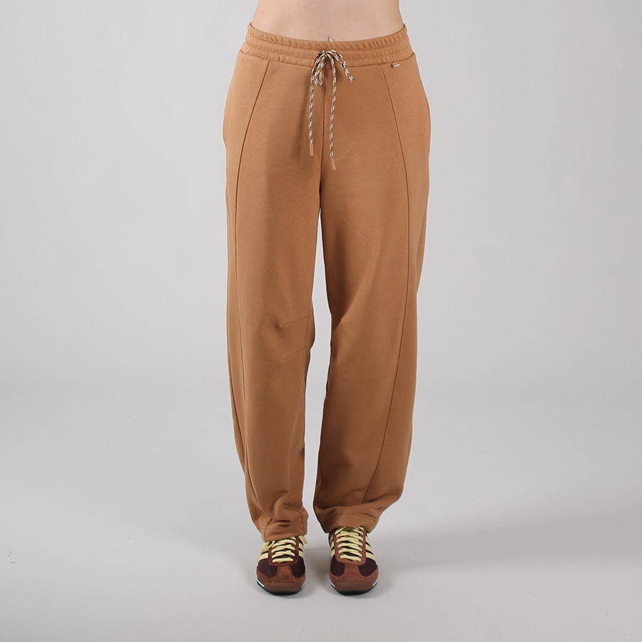 Pantalone in felpa garzata dalla linea morbida, con elastico in vita e coulisse. Le cuciture a vista valorizzano il fit.