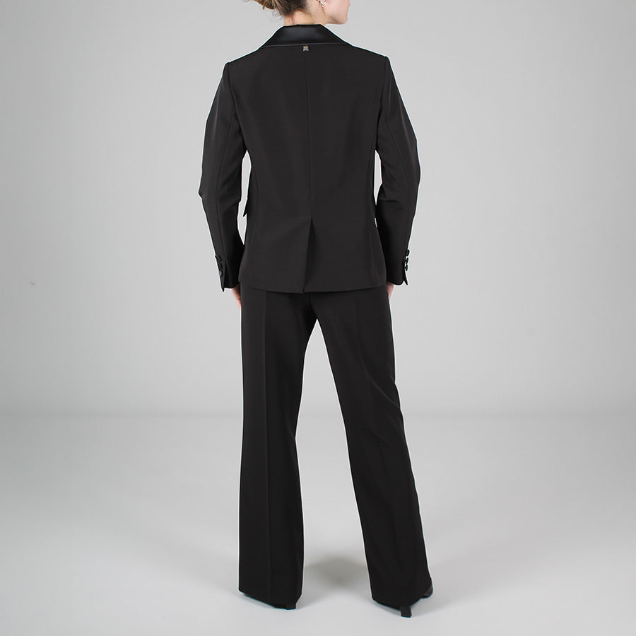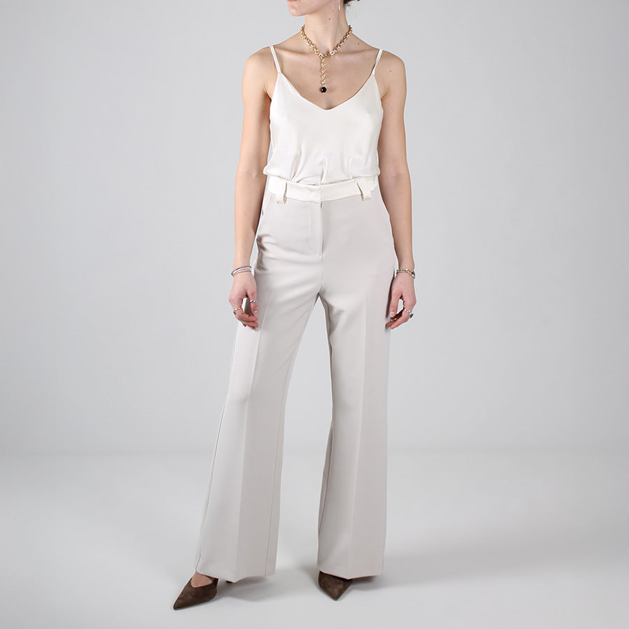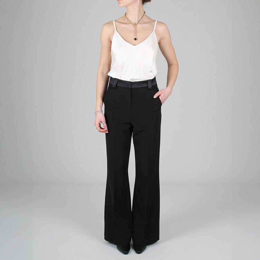 Pantalone elegante a gamba dritta. Chiusura con bottone e zip, fascia in vita e passanti per cintura in raso lucido.