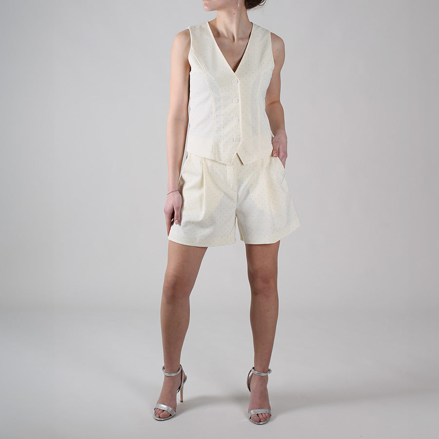 Shorts in viscosa in tessuto fresco e fluido, dal taglio sartoriale, impreziosito da micro strass. Vita regolare, chiusura con bottone e zip e passanti per cintura. Taschine laterali.