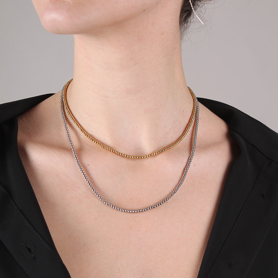 Collana girocollo con sfere piccole, con moschettone a chiusura. In oro o argento.