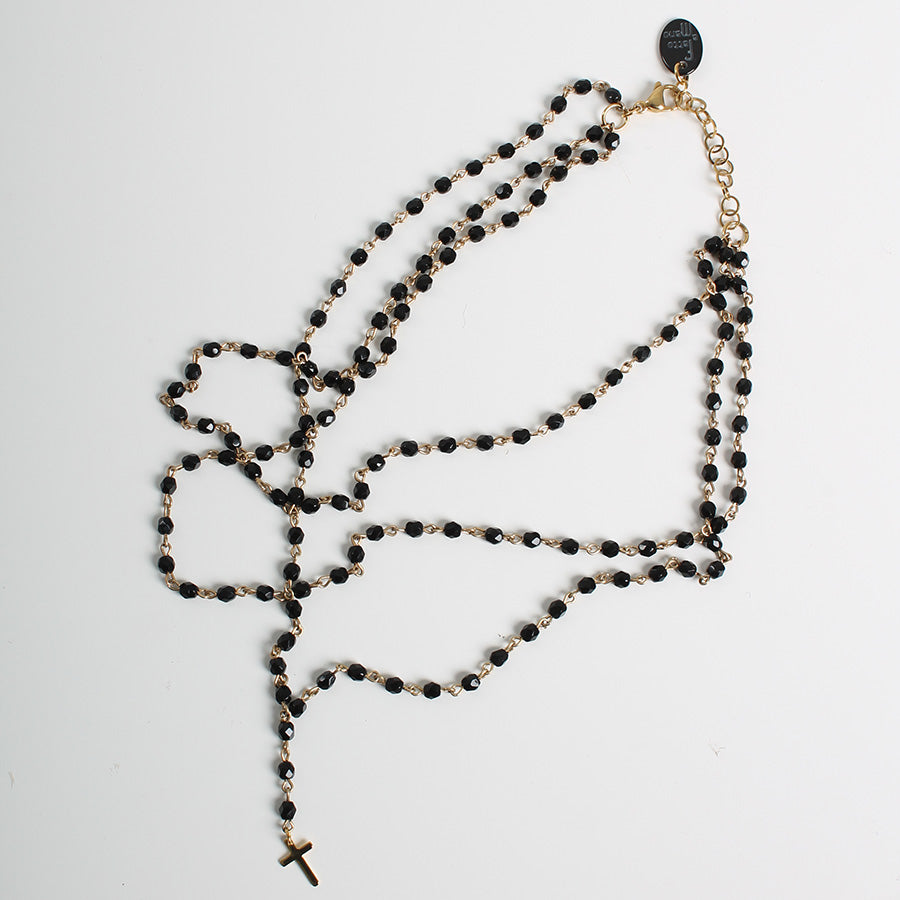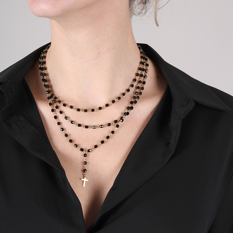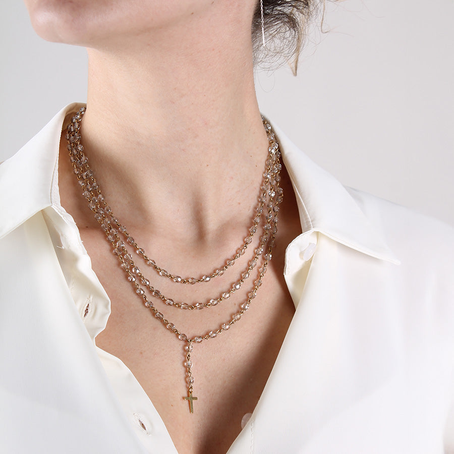Three-strand choker necklace with 4mm crystals. Aluminum cross pendant. Steel lobster clasp closure. Length 26cm. Handmade in Italy by Momi, distributed by Vaso. In compliance with Legislative Decree 206 of 6/9/2005, we hereby inform you that Momi brand products are produced in Italy, in full compliance with current regulations: Made of steel, aluminum, crystals, and resins purchased and processed by Italian companies, they are nickel, lead, and cadmium free, in accordance with current Italian laws.