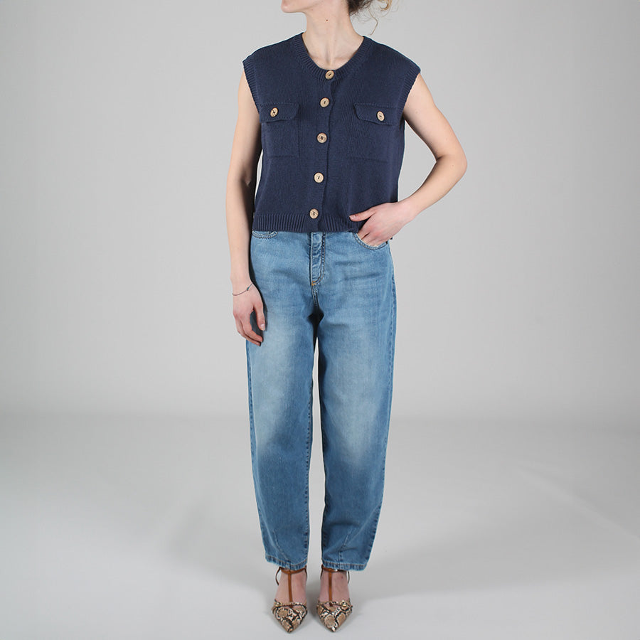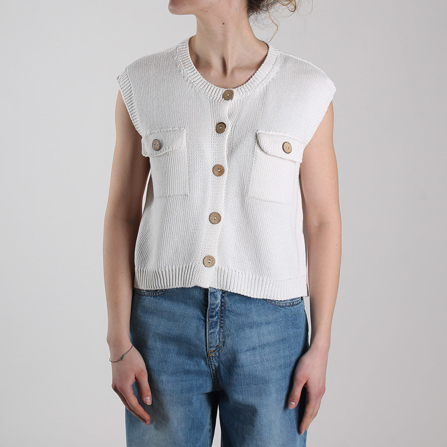 Gilet in cotone. Scollo rotondo, chiusura frontale con bottoni e tasche applicate con patta e bottone.
