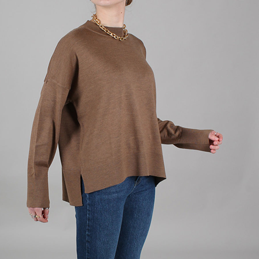Fine-ribbed crew neck and cuffs. Dropped hem at the back with side slits.