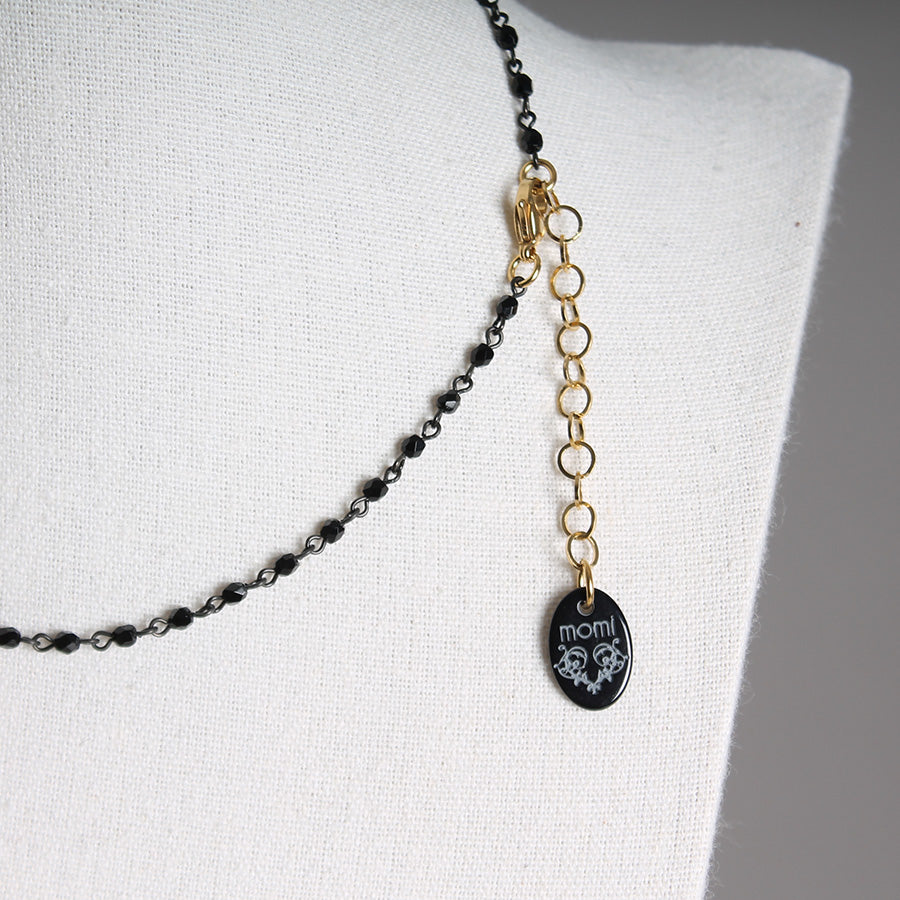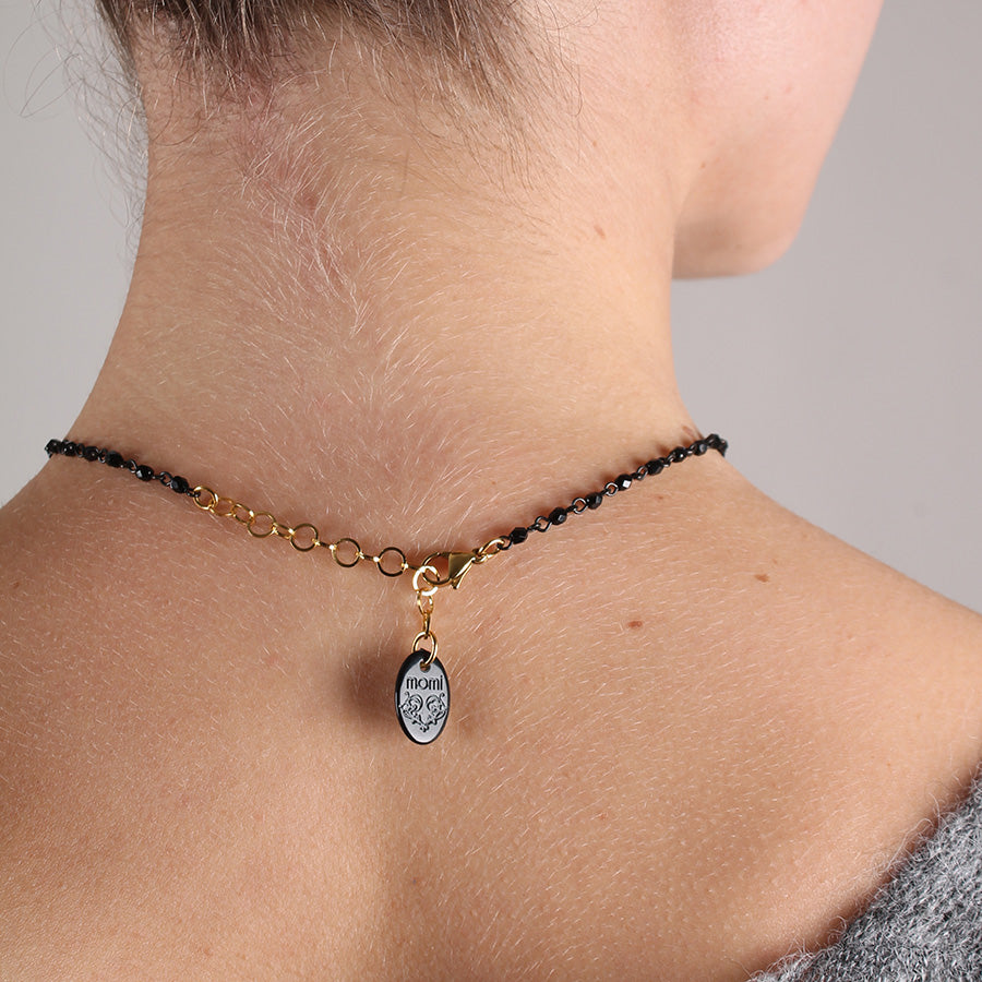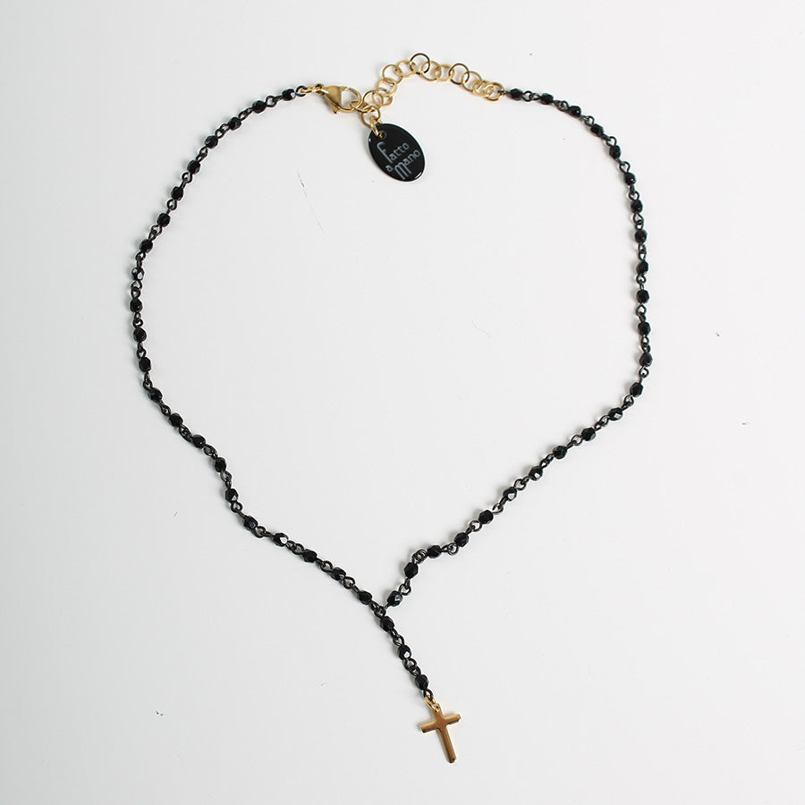 Petit chapelet orné de cristaux noirs en forme de diamant et d'une chaîne noire. Fermoir mousqueton.