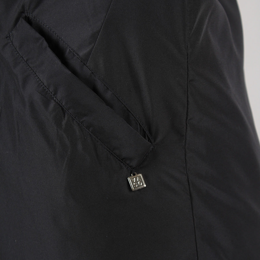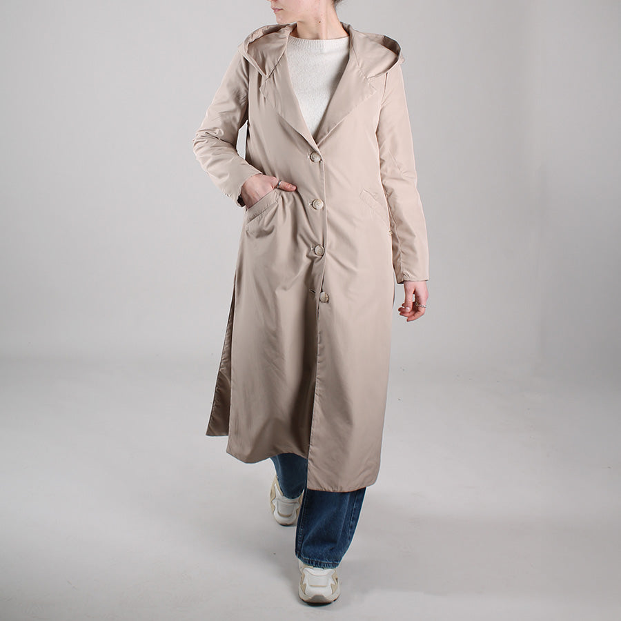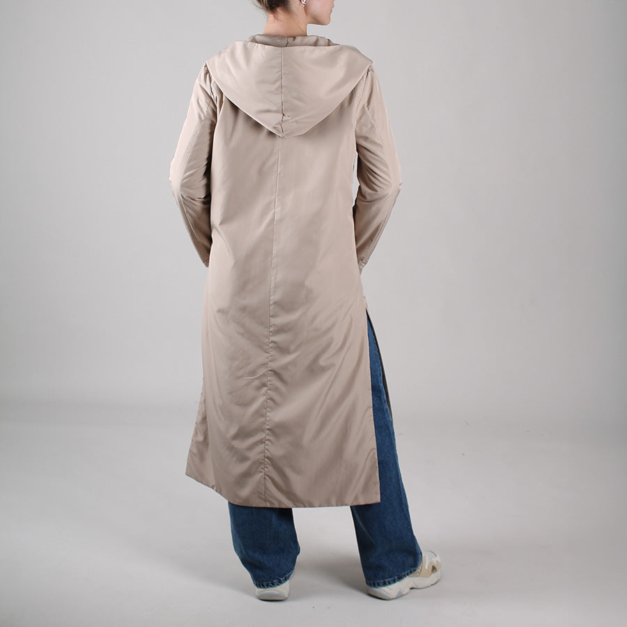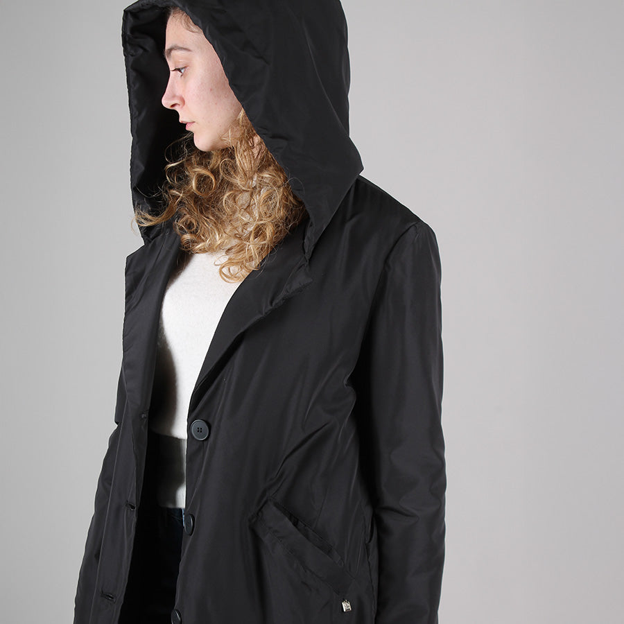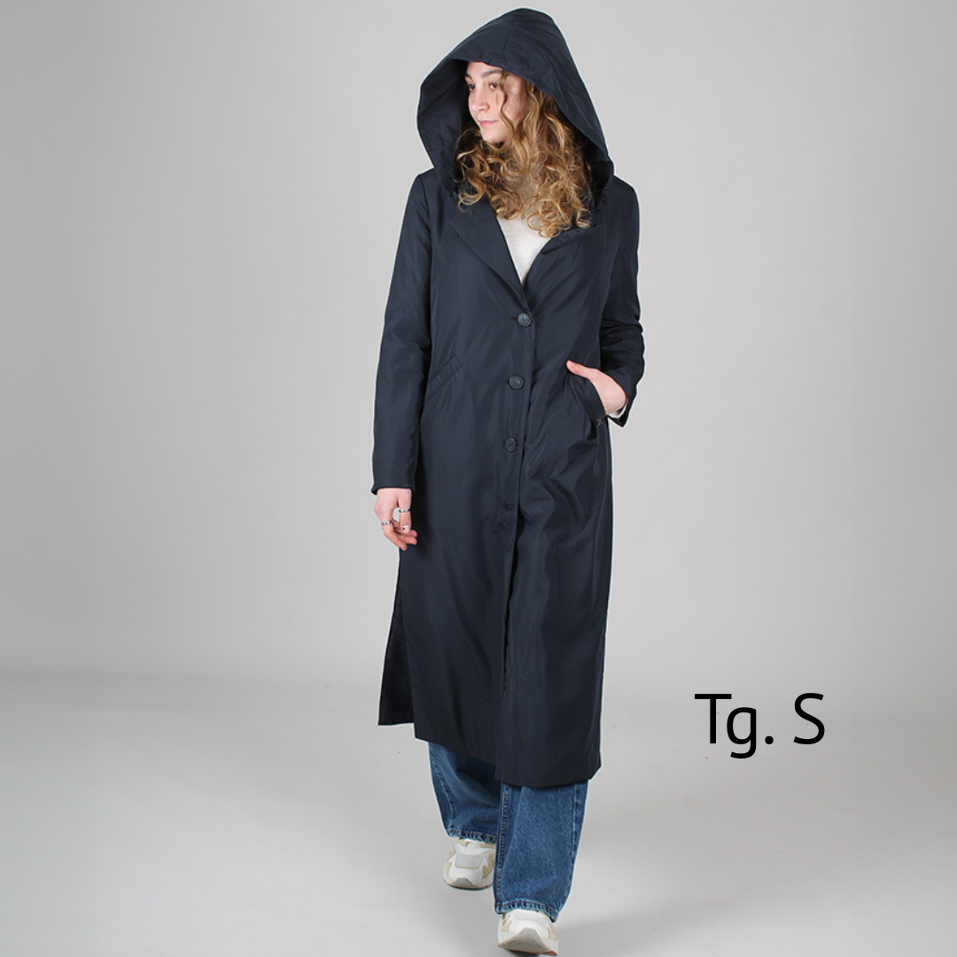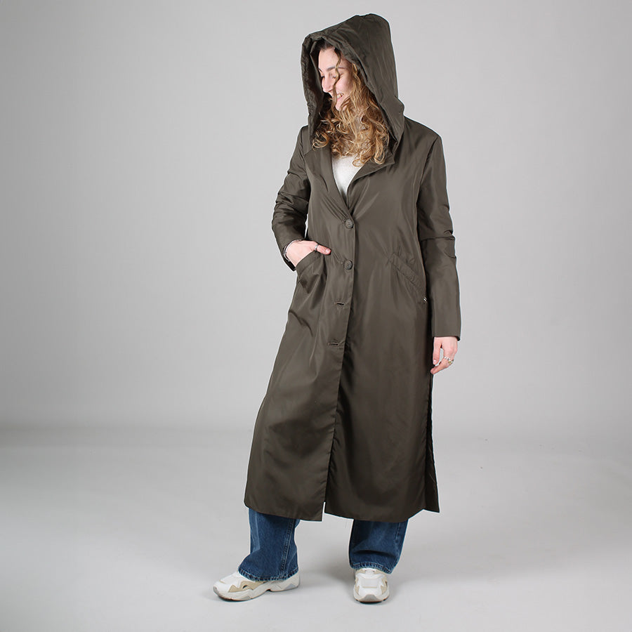 Piumino lungo con chiusura frontale con bottoni, tasche apribili, cappuccio e spacchi laterali.